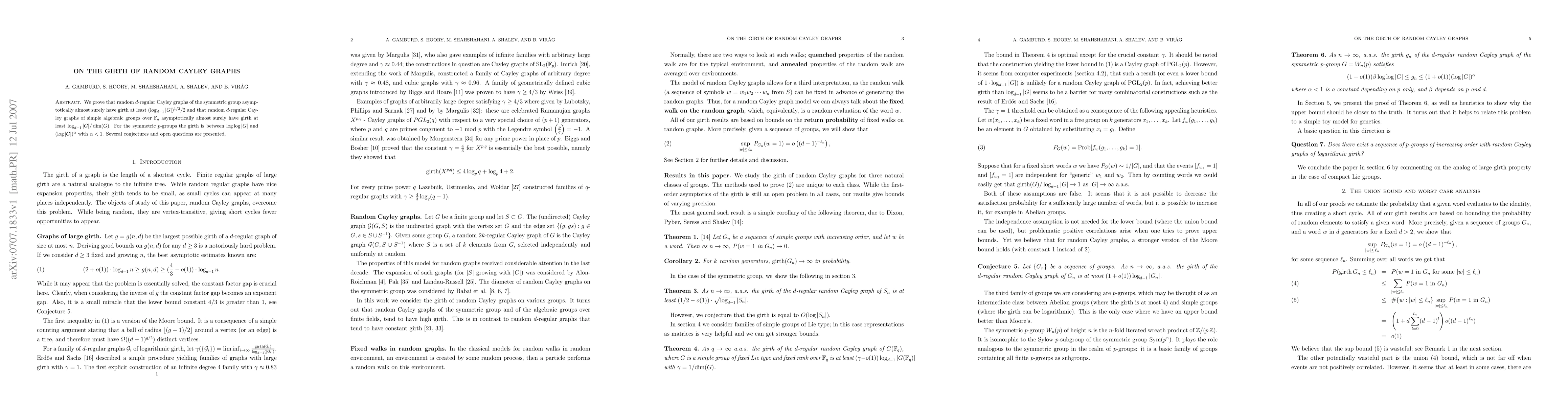 This paper proves that random d-regular Cayley graphs of symmetric groups and simple algebraic groups over finite fields have asymptotically guaranteed minimum girth, with specific bounds depending on group size and dimension. It also discusses the girth for symmetric p-groups and poses several conjectures and open questions.
