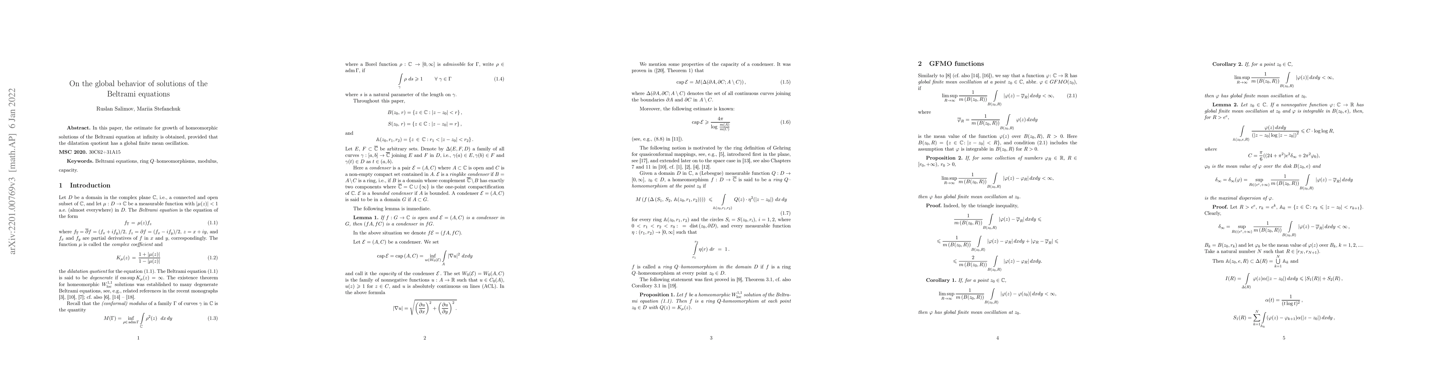 Summary: This paper investigates the global behavior of homeomorphic solutions to Beltrami equations, establishing growth estimates at infinity under the condition that the dilatation quotient has a finite global mean oscillation. The findings provide insights into the asymptotic properties of such solutions.