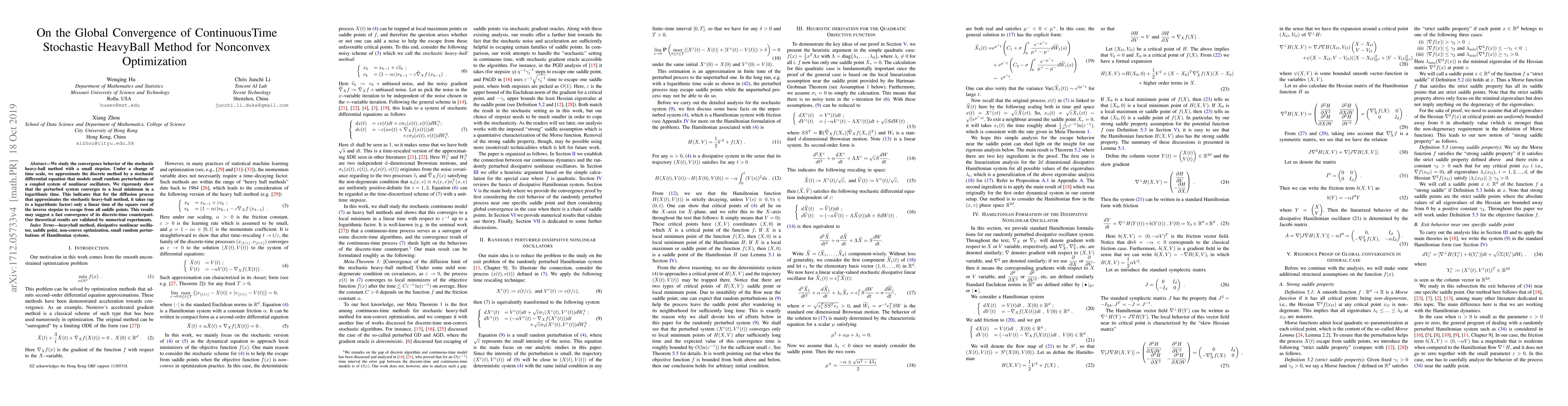 This paper investigates the global convergence of the continuous-time stochastic heavy-ball method for nonconvex optimization, demonstrating that it converges to a local minimum in logarithmic time. Numerical experiments validate the theoretical findings, suggesting fast convergence for the discrete-time version.