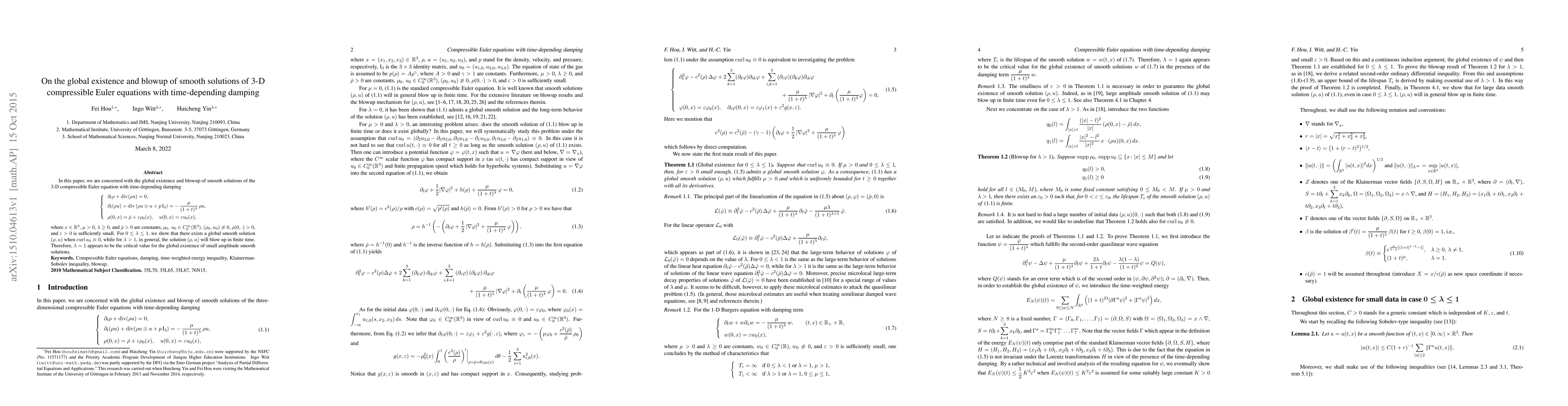 In this paper, we are concerned with the global existence and blowup of smooth solutions of the 3-D compressible Euler equation with time-depending damping $$ \partial_t\rho+\operatorname{div}(\rho u)=0, \quad \partial_t(\rho u)+\operatorname{div}\left(\rho u\otimes u+p\,I_{3}\right)=-\,\frac{\mu}{(1+t)^{\lambda}}\,\rho u, \quad \rho(0,x)=\bar \rho+\varepsilon\rho_0(x),\quad u(0,x)=\varepsilon u_0(x), $$ where $x\in\mathbb R^3$, $\mu>0$, $\lambda\geq 0$, and $\bar\rho>0$ are constants, $\rho_0,\, u_0\in C_0^{\infty}(\mathbb R^3)$, $(\rho_0, u_0)\not\equiv 0$, $\rho(0,\cdot)>0$, and $\varepsilon>0$ is sufficiently small. For $0\leq\lambda\leq1$, we show that there exists a global smooth solution $(\rho, u)$ when $\operatorname{curl} u_0\equiv 0$, while for $\lambda>1$, in general, the solution $(\rho, u)$ will blow up in finite time. Therefore, $\lambda=1$ appears to be the critical value for the global existence of small amplitude smooth solutions.