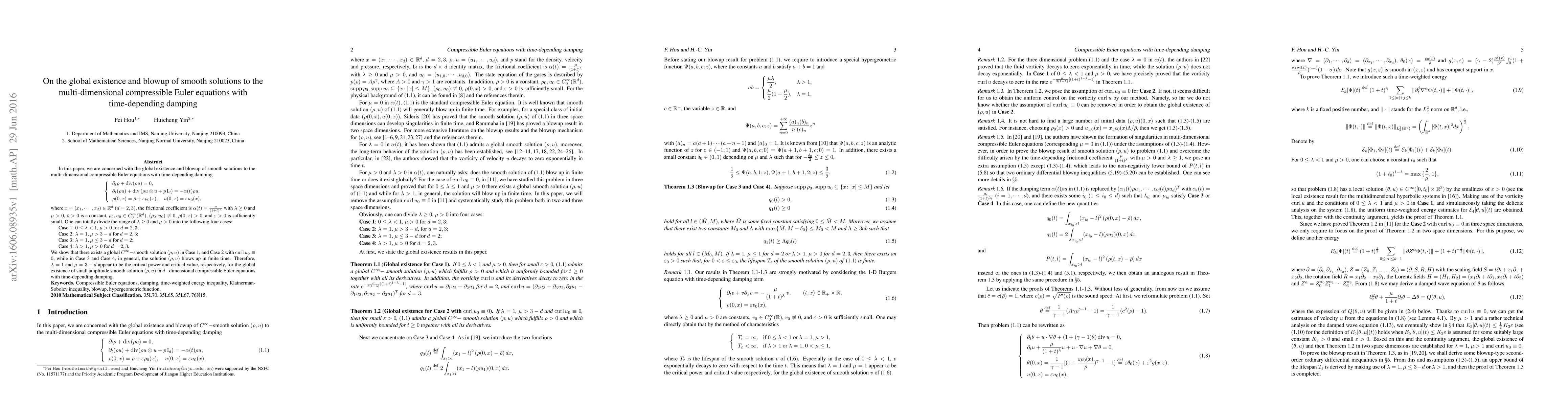 Researchers investigated global existence and blowup of smooth solutions to a compressible Euler equations model with time-dependent damping, finding that certain values of lambda and mu ensure global existence for small amplitude solutions in 2D and 3D cases.