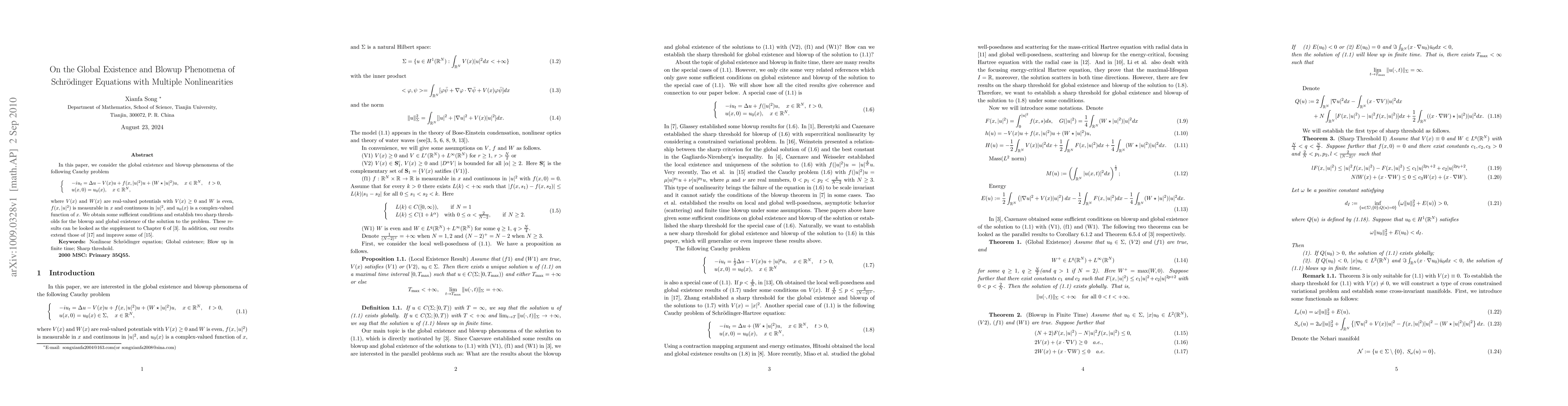 This paper investigates the global existence and blowup phenomena for a Schrödinger equation with multiple nonlinearities. It establishes sufficient conditions and sharp thresholds for the solution's behavior, extending previous results and serving as a supplement to Chapter 6 of Cazenave's work.