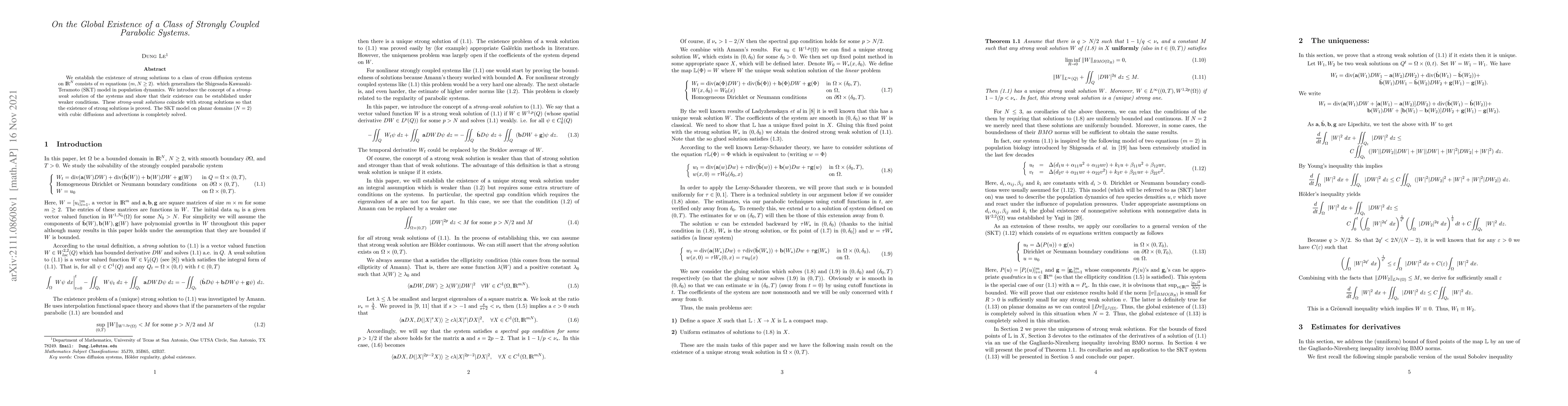 We establish the existence of strong solutions to a class of cross diffusion systems on $\RR^N$ consists of $m$ equations ($m,N\ge 2$). which generalizes the Shigesada-Kawasaki-Teramoto (SKT) model in population dynamics. We introduce the concept of a {\em strong-weak solution} of the systems and show that their existence can be established under weaker conditions. These {\em strong-weak solutions} coincide with strong solutions so that the existence of strong solutions is proved. The SKT model on planar domains ($N=2$) with cubic diffusions and advections is completely solved.