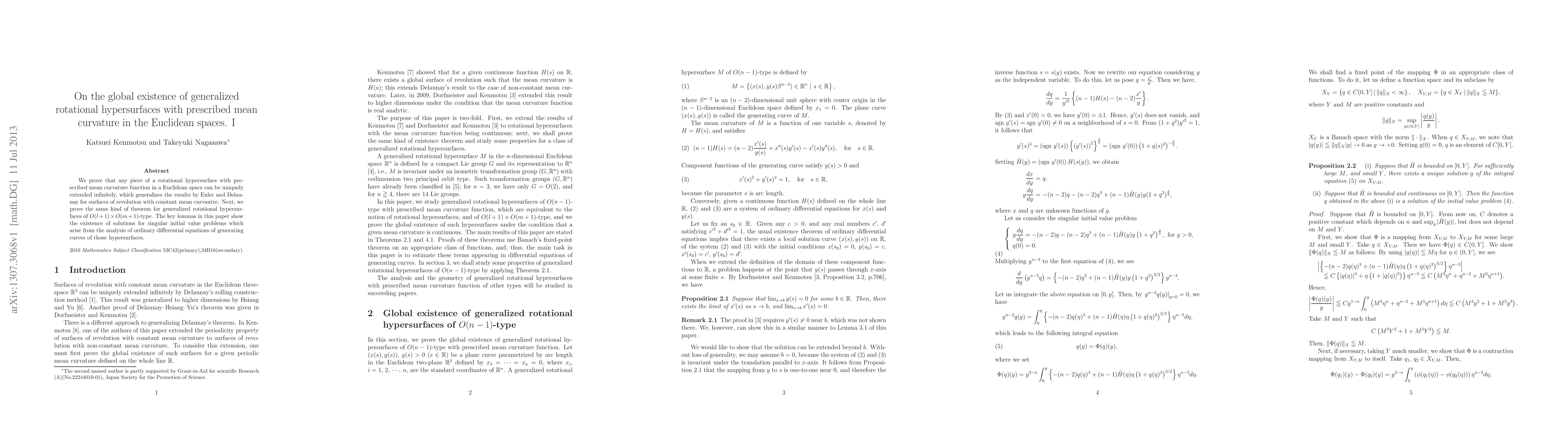 Title: On the global existence of generalized rotational hypersurfaces with prescribed mean curvature in the Euclidean spaces. I Summary: This paper proves the infinite unique extension of rotational hypersurfaces with prescribed mean curvature in Euclidean spaces, generalizing Euler and Delaunay's results, and applies similar methods to generalized rotational hypersurfaces. Key lemmas address the existence of solutions to singular initial value problems arising from the analysis of the generating curves' ordinary differential equations.