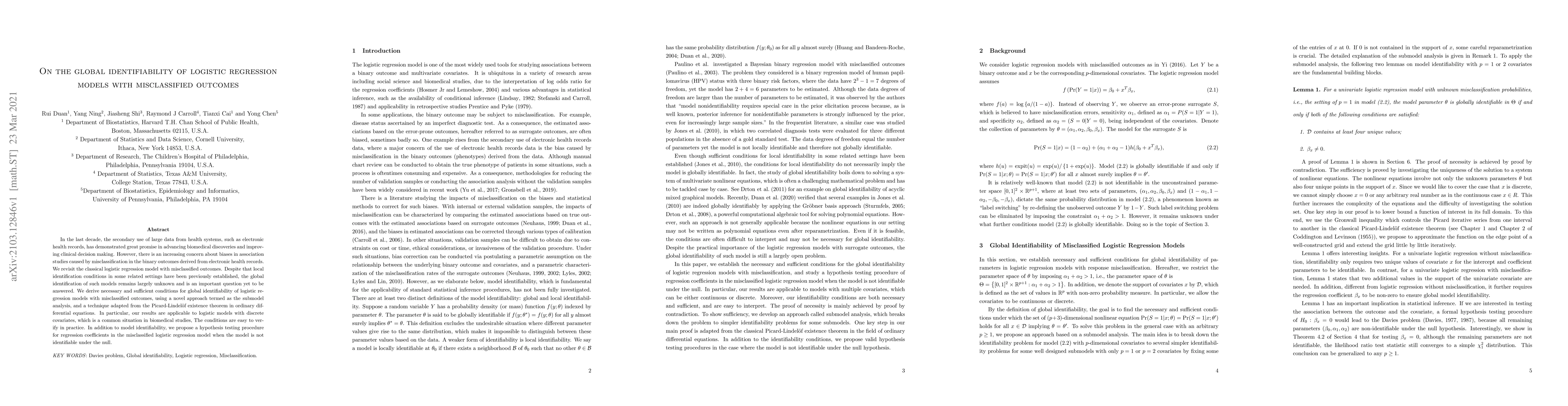 This paper explores the global identifiability of logistic regression models with misclassified outcomes, addressing the challenge of biases in health data analysis. It provides necessary and sufficient conditions for global identifiability using submodel analysis and techniques from differential equations, and proposes a hypothesis testing procedure for regression coefficients in non-identifiable scenarios.