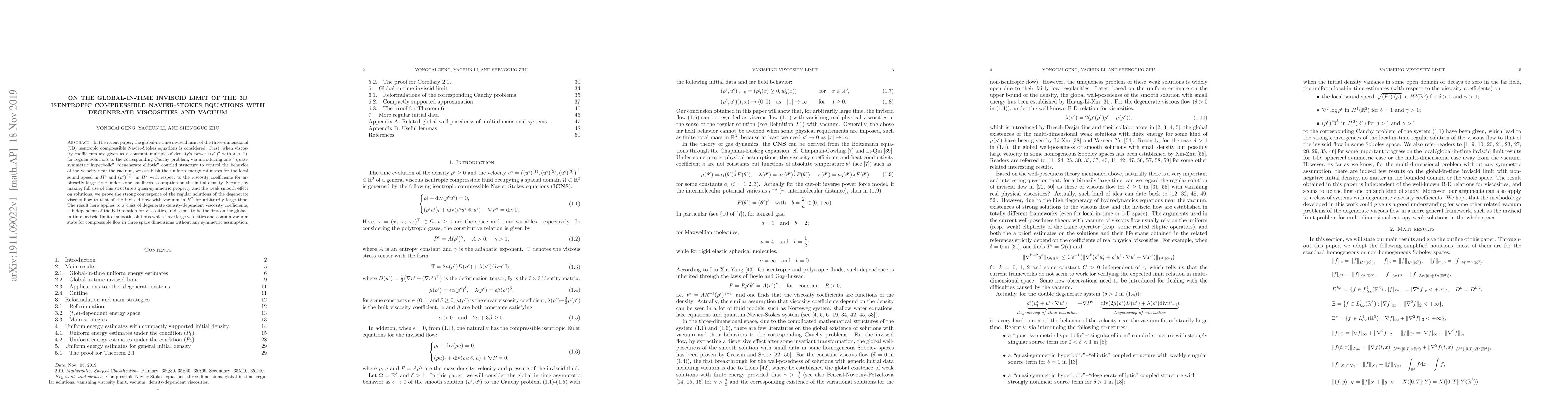 In the recent paper, the global-in-time inviscid limit of the three-dimensional (3D) isentropic compressible Navier-Stokes equations is considered. First, when viscosity coefficients are given as a constant multiple of density's power ($(\rho^\epsilon)^\delta$ with $\delta>1$), for regular solutions to the corresponding Cauchy problem, via introducing one "quasi-symmetric hyperbolic"--"degenerate elliptic" coupled structure to control the behavior of the velocity near the vacuum, we establish the uniform energy estimates for the local sound speed in $H^3$ and $(\rho^\epsilon)^{\frac{\delta-1}{2}}$ in $H^2$ with respect to the viscosity coefficients for arbitrarily large time under some smallness assumption on the initial density. Second, by making full use of this structure's quasi-symmetric property and the weak smooth effect on solutions, we prove the strong convergence of the regular solutions of the degenerate viscous flow to that of the inviscid flow with vacuum in $H^2$ for arbitrarily large time. The result here applies to a class of degenerate density-dependent viscosity coefficients, is independent of the B-D relation for viscosities, and seems to be the first on the global-in-time inviscid limit of smooth solutions which have large velocities and contain vacuum state for compressible flow in three space dimensions without any symmetric assumption.