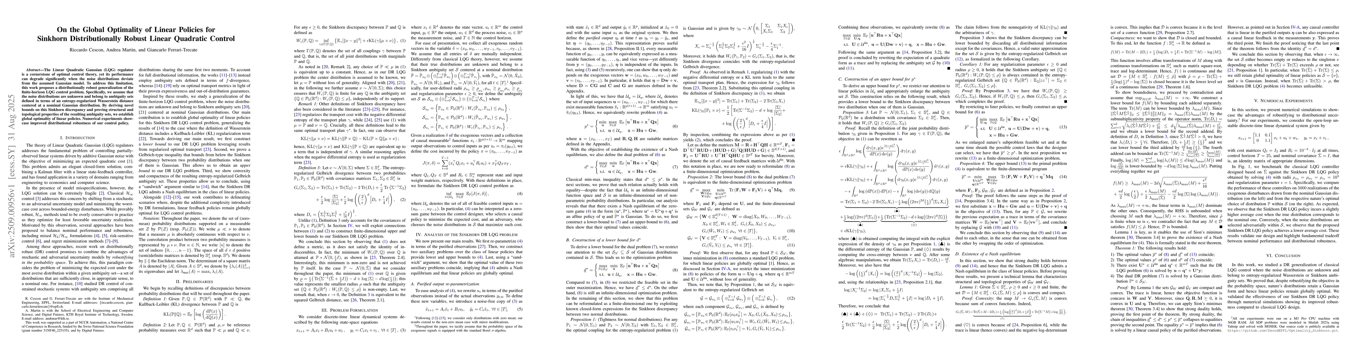 The Linear Quadratic Gaussian (LQG) regulator is a cornerstone of optimal control theory, yet its performance can degrade significantly when the noise distributions deviate from the assumed Gaussian model. To address this limitation, this work proposes a distributionally robust generalization of the finite-horizon LQG control problem. Specifically, we assume that the noise distributions are unknown and belong to ambiguity sets defined in terms of an entropy-regularized Wasserstein distance centered at a nominal Gaussian distribution. By deriving novel bounds on this Sinkhorn discrepancy and proving structural and topological properties of the resulting ambiguity sets, we establish global optimality of linear policies. Numerical experiments showcase improved distributional robustness of our control policy.