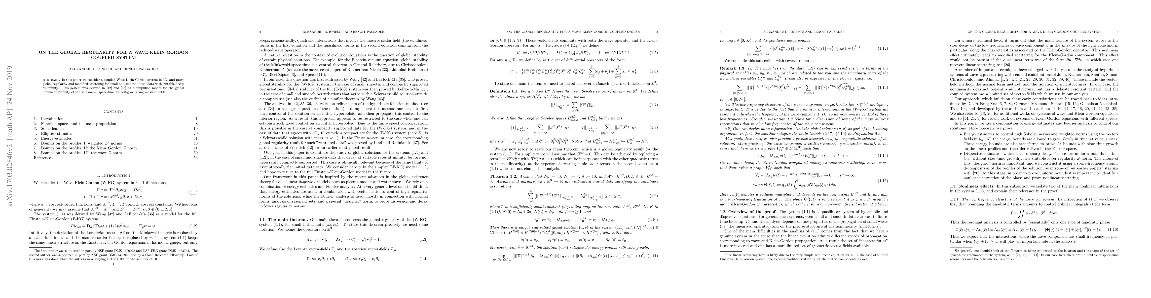 Summary: This paper proves global regularity and modified scattering for a coupled Wave-Klein-Gordon system in 3D under small, smooth initial conditions, establishing the system's role in modeling the global nonlinear stability of Minkowski space-time for self-gravitating massive fields.