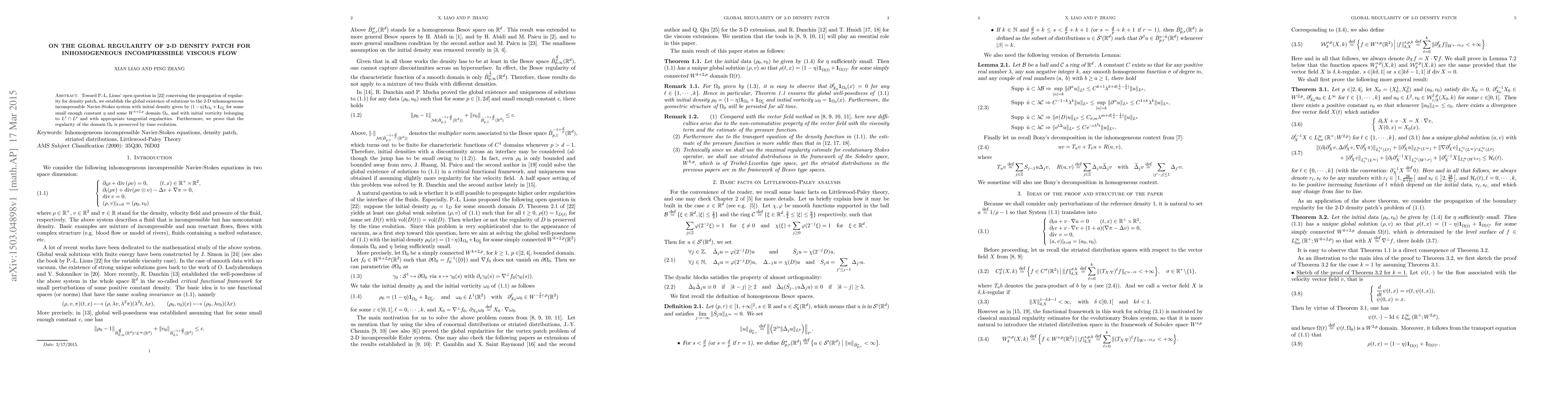 This paper addresses P.-L. Lions' open question on the regularity of density patches in 2-D inhomogeneous incompressible flows, proving global existence and regularity preservation for the Navier-Stokes system with specific initial density and vorticity conditions.