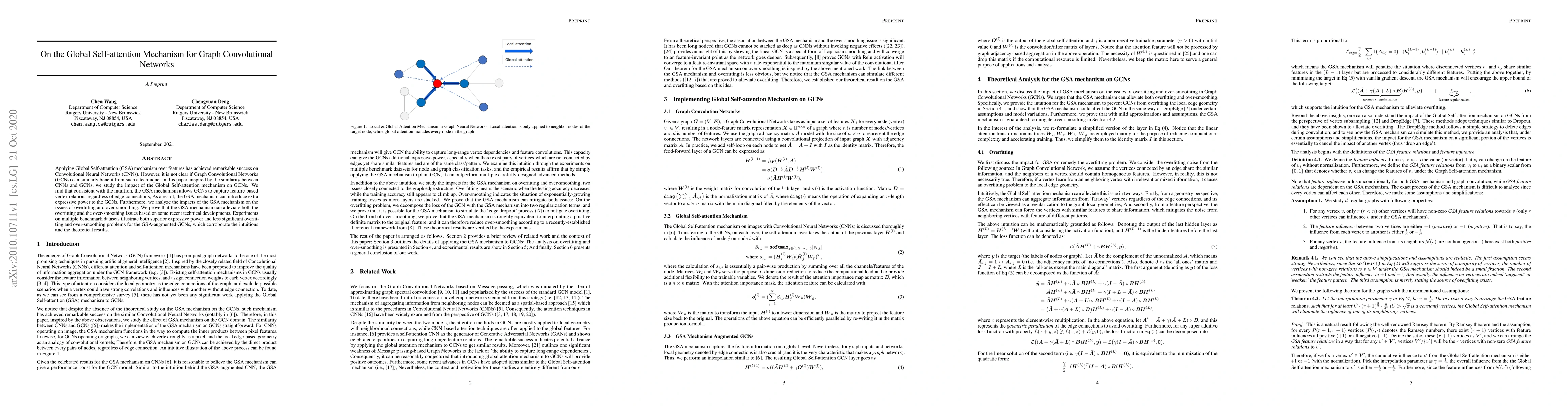 Applying Global Self-attention (GSA) mechanism over features has achieved remarkable success on Convolutional Neural Networks (CNNs). However, it is not clear if Graph Convolutional Networks (GCNs) can similarly benefit from such a technique. In this paper, inspired by the similarity between CNNs and GCNs, we study the impact of the Global Self-attention mechanism on GCNs. We find that consistent with the intuition, the GSA mechanism allows GCNs to capture feature-based vertex relations regardless of edge connections; As a result, the GSA mechanism can introduce extra expressive power to the GCNs. Furthermore, we analyze the impacts of the GSA mechanism on the issues of overfitting and over-smoothing. We prove that the GSA mechanism can alleviate both the overfitting and the over-smoothing issues based on some recent technical developments. Experiments on multiple benchmark datasets illustrate both superior expressive power and less significant overfitting and over-smoothing problems for the GSA-augmented GCNs, which corroborate the intuitions and the theoretical results.