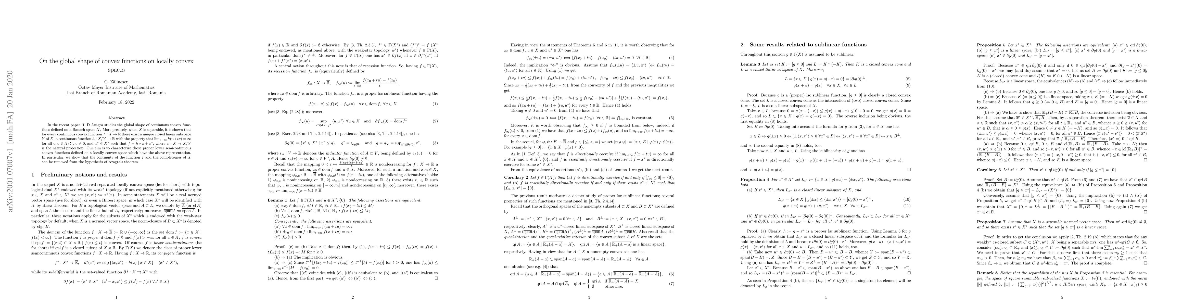 In the recent paper \cite{Aza:19} D Azagra studies the global shape of continuous convex functions defined on a Banach space $X$. More precisely, when $X$ is separable, it is shown that for every continuous convex function $f:X\rightarrow\mathbb{R}$ there exist a unique closed linear subspace $Y$ of $X$, a continuous function $h:X/Y\rightarrow\mathbb{R}$ with the property that $\lim_{t\rightarrow\infty}h(u+tv)=\infty$ for all $u,v\in X/Y$, $v\neq0$, and $x^{\ast}\in X^{\ast}$ such that $f=h\circ\pi+x^{\ast}$, where $\pi :X\rightarrow X/Y$ is the natural projection. Our aim is to characterize those proper lower semi\-continuous convex functions defined on a locally convex space which have the above representation. In particular, we show that the continuity of the function $f$ and the completeness of $X$ can be removed from the hypothesis of Azagra's theorem.