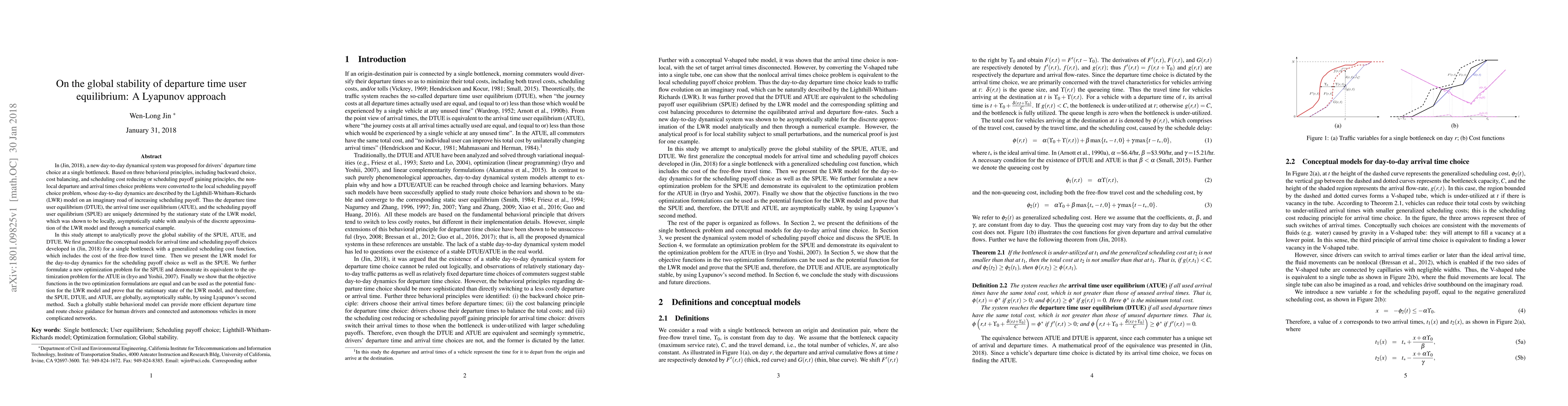 In (Jin, 2018), a new day-to-day dynamical system was proposed for drivers' departure time choice at a single bottleneck. Based on three behavioral principles, the nonlocal departure and arrival times choice problems were converted to the local scheduling payoff choice problem, whose day-to-day dynamics are described by the Lighthill-Whitham-Richards (LWR) model on an imaginary road of increasing scheduling payoff. Thus the departure time user equilibrium (DTUE), the arrival time user equilibrium (ATUE), and the scheduling payoff user equilibrium (SPUE) are uniquely determined by the stationary state of the LWR model, which was shown to be locally, asymptotically stable with analysis of the discrete approximation of the LWR model and through a numerical example. In this study attempt to analytically prove the global stability of the SPUE, ATUE, and DTUE. We first generalize the conceptual models for arrival time and scheduling payoff choices developed in (Jin, 2018) for a single bottleneck with a generalized scheduling cost function, which includes the cost of the free-flow travel time. Then we present the LWR model for the day-to-day dynamics for the scheduling payoff choice as well as the SPUE. We further formulate a new optimization problem for the SPUE and demonstrate its equivalent to the optimization problem for the ATUE in (Iryo and Yoshii, 2007). Finally we show that the objective functions in the two optimization formulations are equal and can be used as the potential function for the LWR model and prove that the stationary state of the LWR model, and therefore, the SPUE, DTUE, and ATUE, are globally, asymptotically stable, by using Lyapunov's second method. Such a globally stable behavioral model can provide more efficient departure time and route choice guidance for human drivers and connected and autonomous vehicles in more complicated networks.