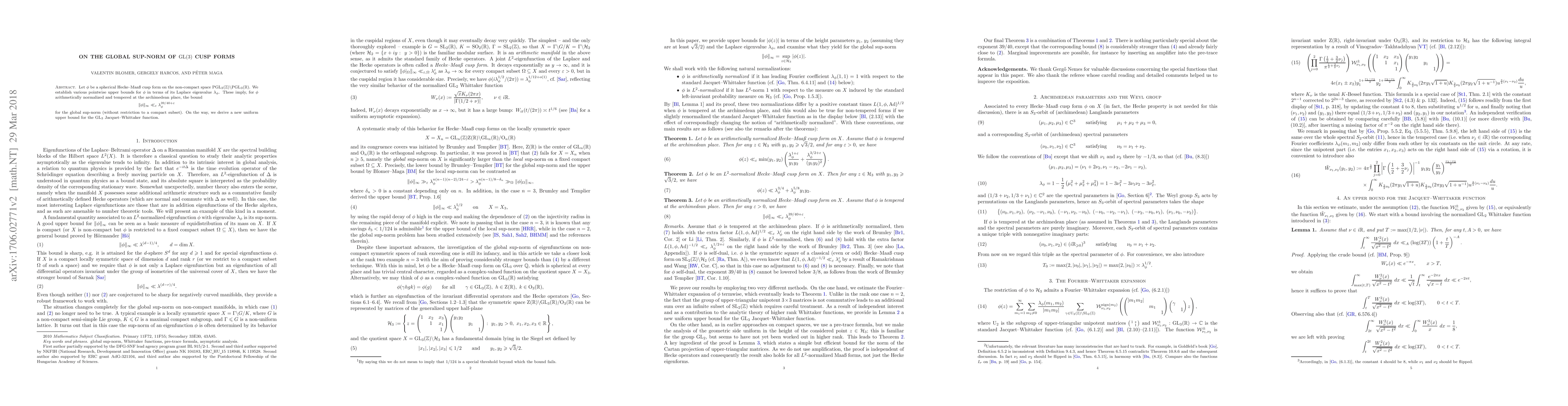 Summary: This paper establishes upper bounds for the global sup-norm of GL(3) cusp forms in terms of their Laplace eigenvalues, proving $\|\phi\|_\infty\ll_\epsilon \lambda_{\phi}^{39/40+\epsilon}$ for arithmetically normalized and tempered forms, and also derives a new uniform upper bound for the GL(3) Jacquet-Whittaker function.