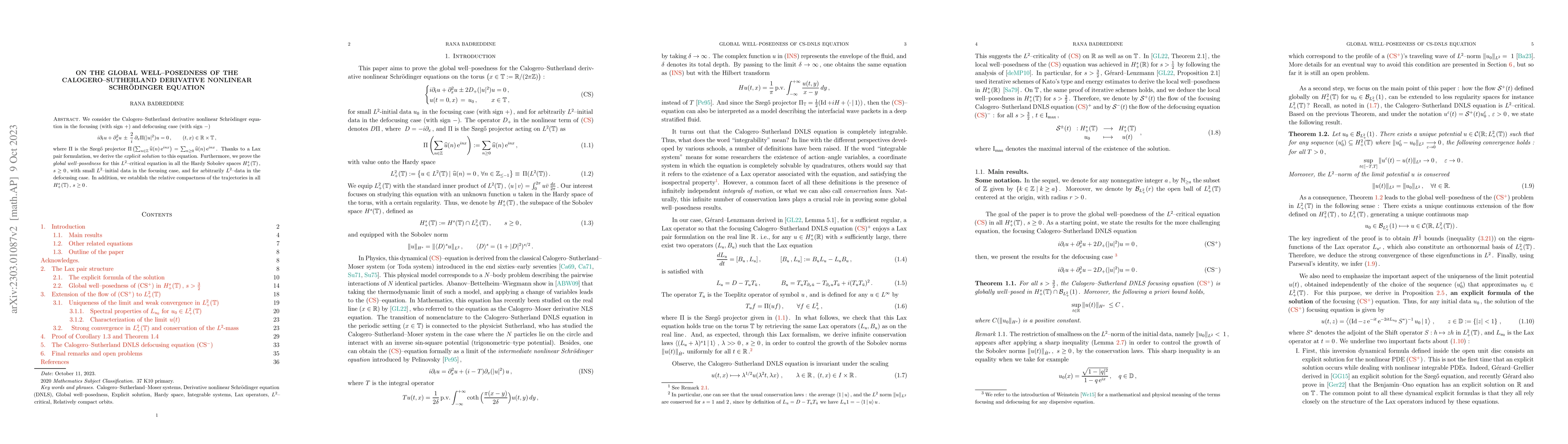 We consider the Calogero-Sutherland derivative nonlinear Schr\"odinger equation in the focusing (with sign $+$) and defocusing case (with sign $-$) $$ i\partial_tu+\partial_x^2u\,\pm\,\frac2i\,\partial_x\Pi(|u|^2)u=0\,,\qquad (t,x)\in\mathbb{R}\times\mathbb{T}, $$ where $\Pi$ is the Szeg\H{o} projector $\Pi\left(\sum_{n\in \mathbb{Z}}\widehat{u}(n)\mathrm{e}^{inx}\right)=\sum_{n\geq 0 }\widehat{u}(n)\mathrm{e}^{inx}$. Thanks to a Lax pair formulation, we derive the explicit solution to this equation. Furthermore, we prove the global well-posedness for this $L^2$-critical equation in all the Hardy Sobolev spaces $H^s_+(\mathbb{T}),$ $s\geq0\,,$ with small $L^2$-initial data in the focusing case, and for arbitrarily $L^2$-data in the defocusing case. In addition, we establish the relative compactness of the trajectories in all $H^s_+(\mathbb{T}),$ $s\geq0\,.$