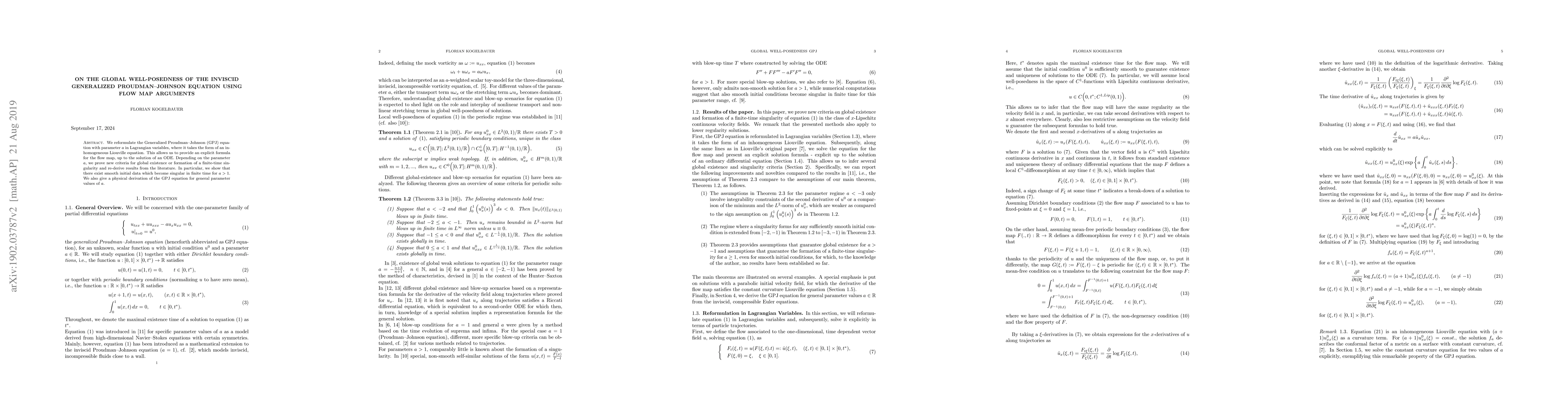 We reformulate the Generalized Proudman--Johnson (GPJ) equation with parameter a in Lagrangian variables, where it takes the form of an inhomogeneous Liouville equation. This allows us to provide an explicitformula for the flow map, up to the solution of an ODE. Depending on the parameter a, we prove new criteria for global existence or formation of a finite-time singularity. In particular, we show that there exist smooth initial data which become singular in finite time for a > 1. Also, we give a physical derivation of the GPJ equation for general parameter values of a.