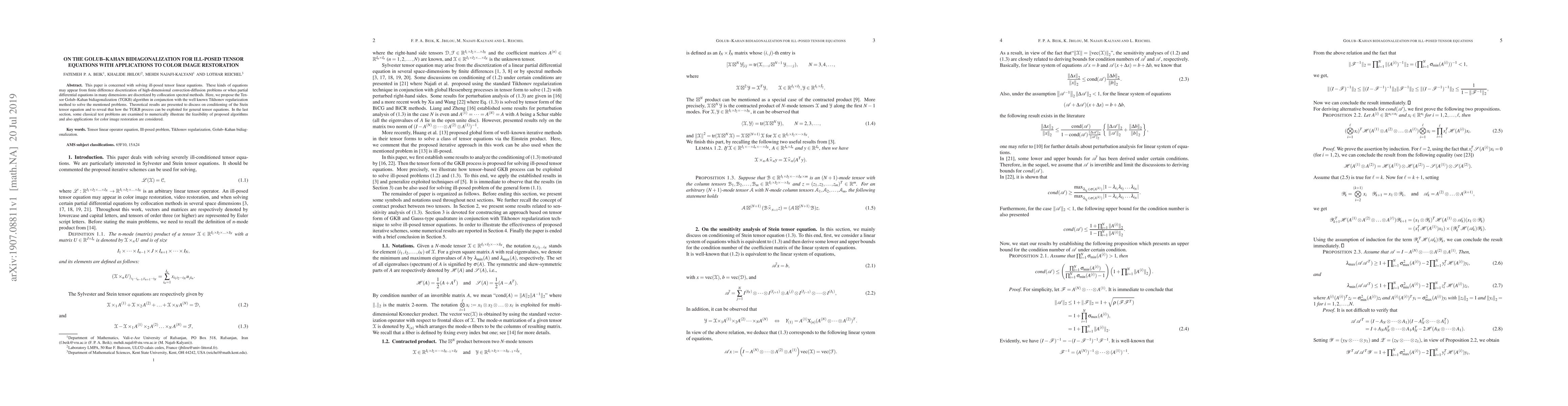 This paper proposes the Tensor Golub-Kahan bidiagonalization (TGKB) algorithm in conjunction with Tikhonov regularization to solve ill-posed tensor linear equations, demonstrating its application in color image restoration through numerical tests. Theoretical analysis discusses the conditioning of the Stein tensor equation and the effectiveness of TGKB for general tensor equations.
