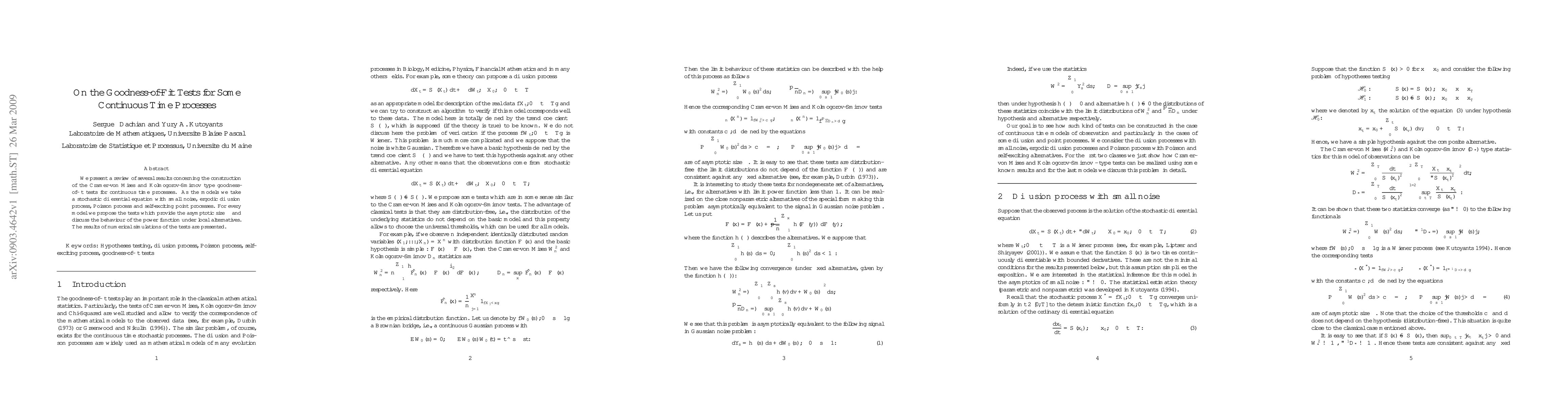 This paper reviews the construction of Cramer-von Mises and Kolmogorov-Smirnov type goodness-of-fit tests for continuous time processes, including stochastic differential equations, ergodic diffusion processes, Poisson processes, and self-exciting point processes, and discusses their asymptotic sizes and power functions through numerical simulations.