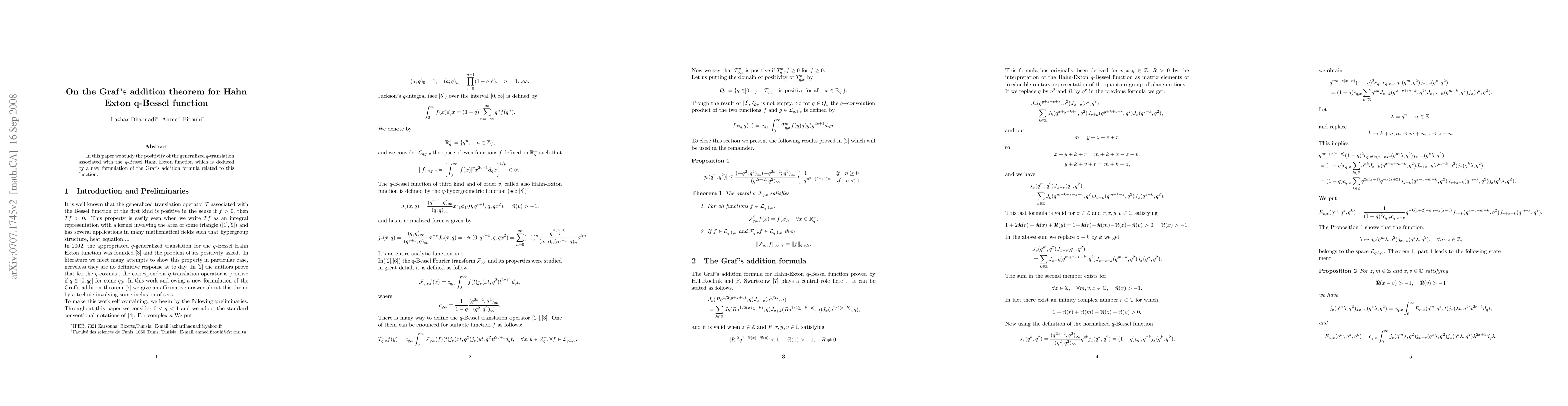 This paper investigates the positivity of a generalized $q$-translation for the Hahn Exton $q$-Bessel function, utilizing a newly formulated version of Graf's addition theorem to achieve this.