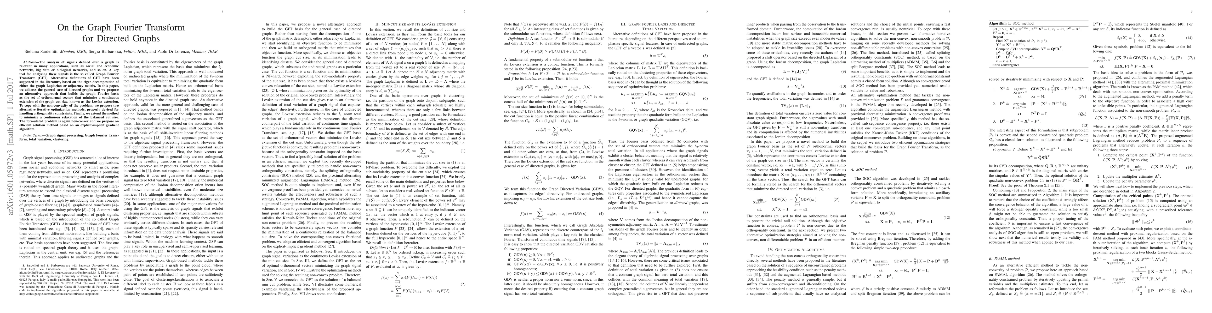 This paper proposes an alternative Graph Fourier Transform (GFT) for directed graphs, constructing the GFT basis by minimizing the Lovasz extension of graph cut size. It introduces two optimization methods to handle the non-convexity and extends the approach to minimize a continuous relaxation of the balanced cut size using an efficient gradient algorithm.