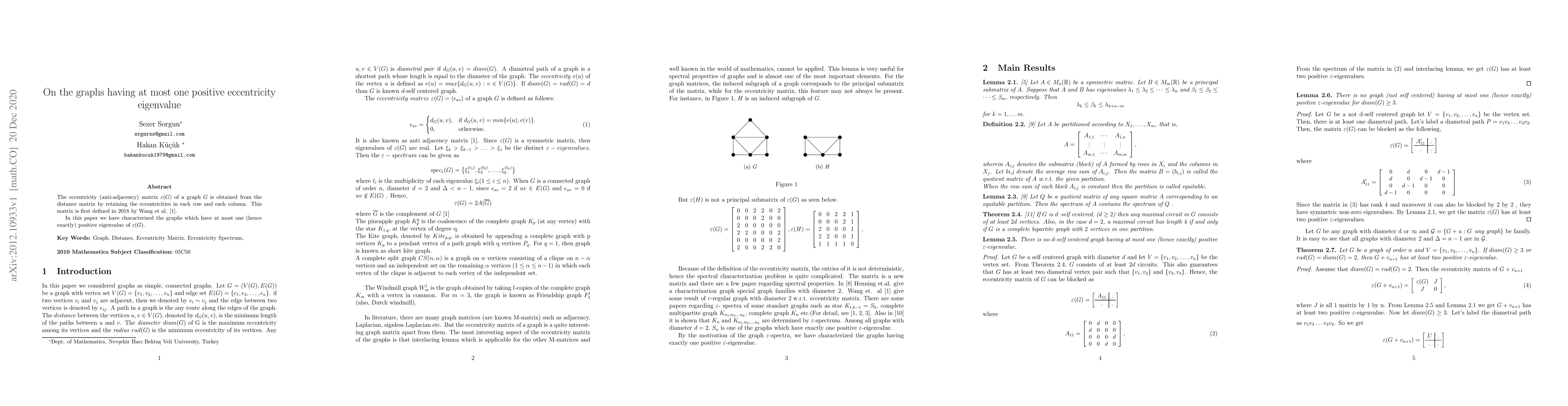 The eccentricity (anti-adjacency) matrix $\varepsilon(G)$ of a graph $G$ is obtained from the distance matrix by retaining the eccentricities in each row and each column. This matrix is first defined in 2018 by Wang et al. \cite{1}. In this paper we have characterized the graphs which have at most one (hence exactly) positive eigenvalue of $\varepsilon(G)$.