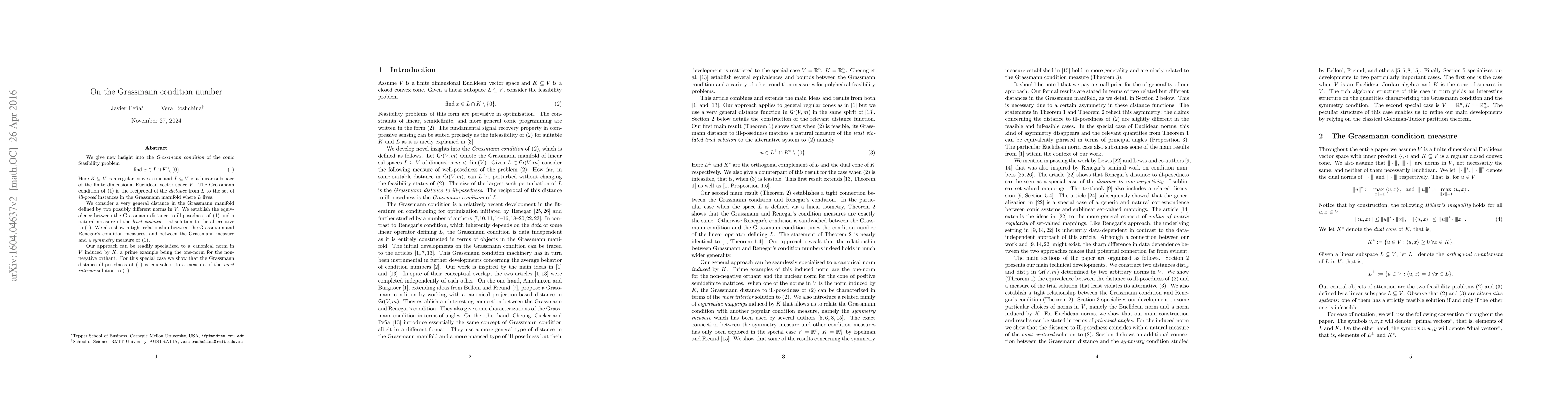 We give new insight into the Grassmann condition of the conic feasibility problem \[ x \in L \cap K \setminus\{0\}. \] Here $K\subseteq V$ is a regular convex cone and $L\subseteq V$ is a linear subspace of the finite dimensional Euclidean vector space $V$. The Grassmann condition of this problem is the reciprocal of the distance from $L$ to the set of ill-posed instances in the Grassmann manifold where $L$ lives. We consider a very general distance in the Grassmann manifold defined by two possibly different norms in $V$. We establish the equivalence between the Grassmann distance to ill-posedness of the above problem and a natural measure of the least violated trial solution to its alternative feasibility problem. We also show a tight relationship between the Grassmann and Renegar's condition measures, and between the Grassman measure and a symmetry measure of the above feasibility problem. Our approach can be readily specialized to a canonical norm in $V$ induced by $K$, a prime example being the one-norm for the non-negative orthant. For this special case we show that the Grassmann distance ill-posedness of is equivalent to a measure of the most interior solution to the above conic feasibility problem.