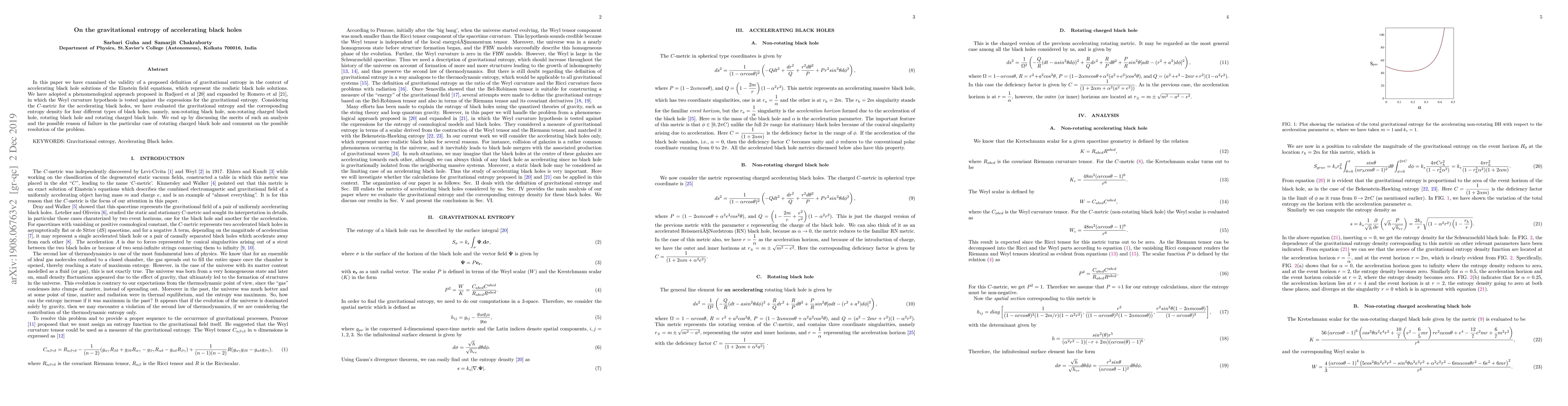 This paper examines the gravitational entropy of various accelerating black hole solutions using a phenomenological approach based on the Weyl curvature hypothesis. It evaluates entropy for four types of black holes and discusses the merits and challenges, particularly highlighting issues with the rotating charged black hole.