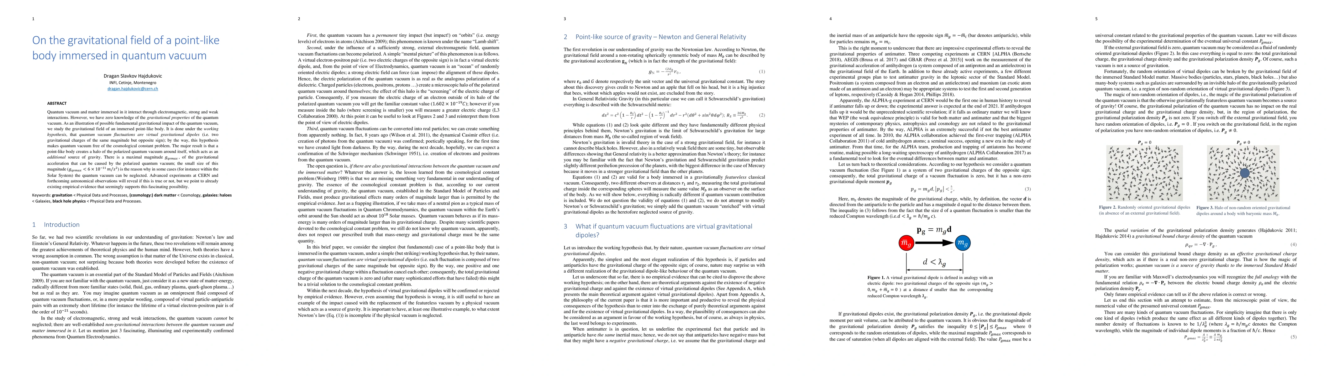 This paper explores the gravitational field of a point-like body in a quantum vacuum, proposing that vacuum fluctuations behave like virtual gravitational dipoles. It concludes that such a body creates a gravitational halo from the polarized quantum vacuum, contributing a small but potentially measurable gravitational acceleration.
