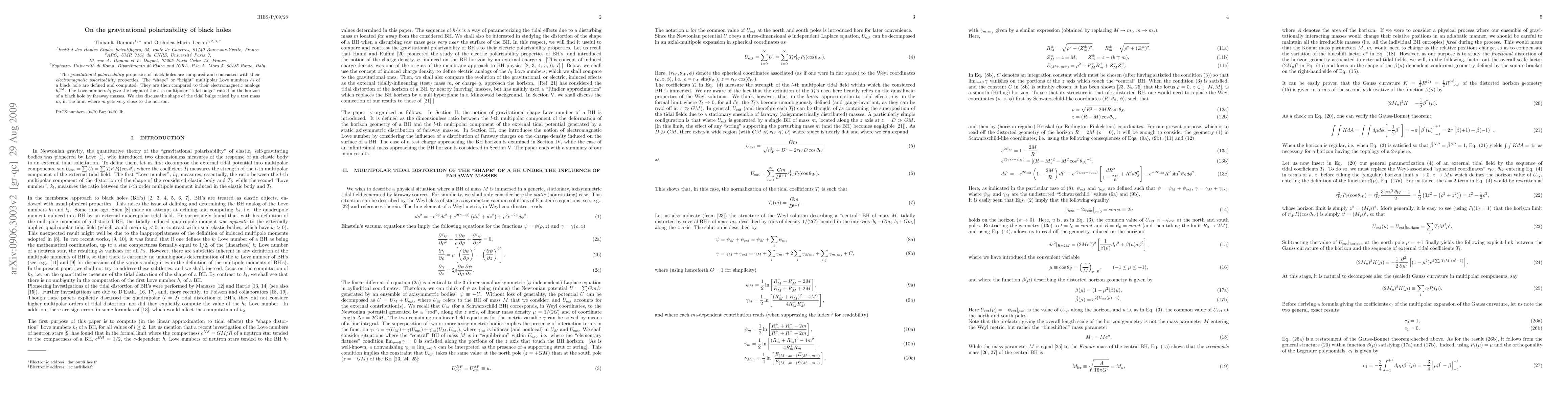 The gravitational polarizability properties of black holes are compared and contrasted with their electromagnetic polarizability properties. The "shape" or "height" multipolar Love numbers h_l of a black hole are defined and computed. They are then compared to their electromagnetic analogs h_l^{EM}. The Love numbers h_l give the height of the l-th multipolar "tidal bulge" raised on the horizon of a black hole by faraway masses. We also discuss the shape of the tidal bulge raised by a test mass m, in the limit where m gets very close to the horizon.