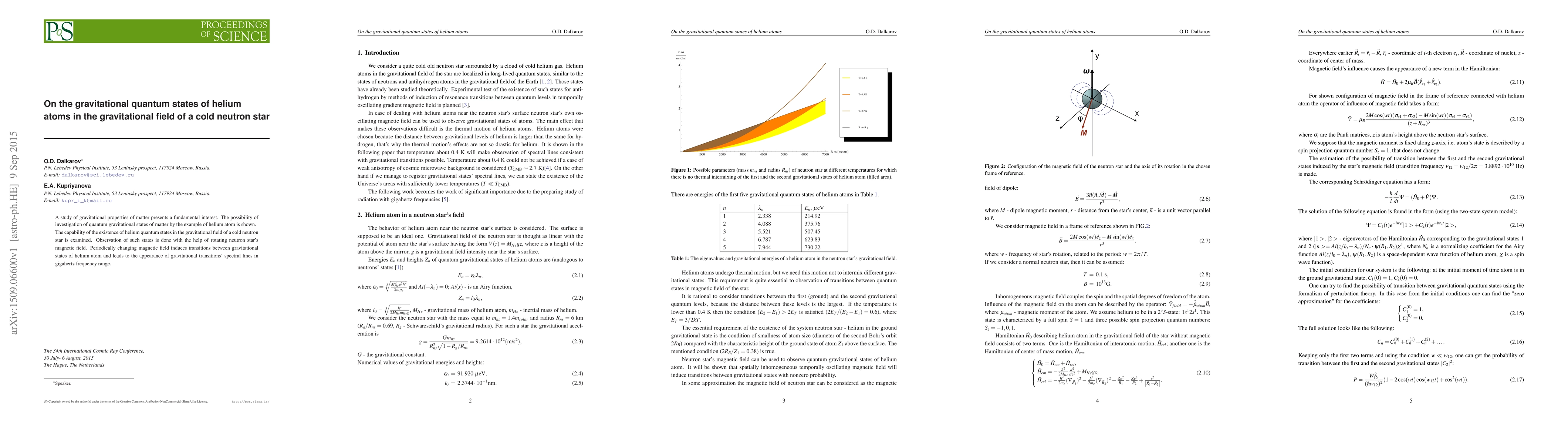 A study of gravitational properties of matter presents a fundamental interest. The possibility of investigation of quantum gravitational states of matter by the example of helium atom is shown. The capability of the existence of helium quantum states in the gravitational field of a cold neutron star is examined. Observation of such states is done with the help of rotating neutron star's magnetic field. Periodically changing magnetic field induces transitions between gravitational states of helium atom and leads to the appearance of gravitational transitions' spectral lines in gigahertz frequency range.