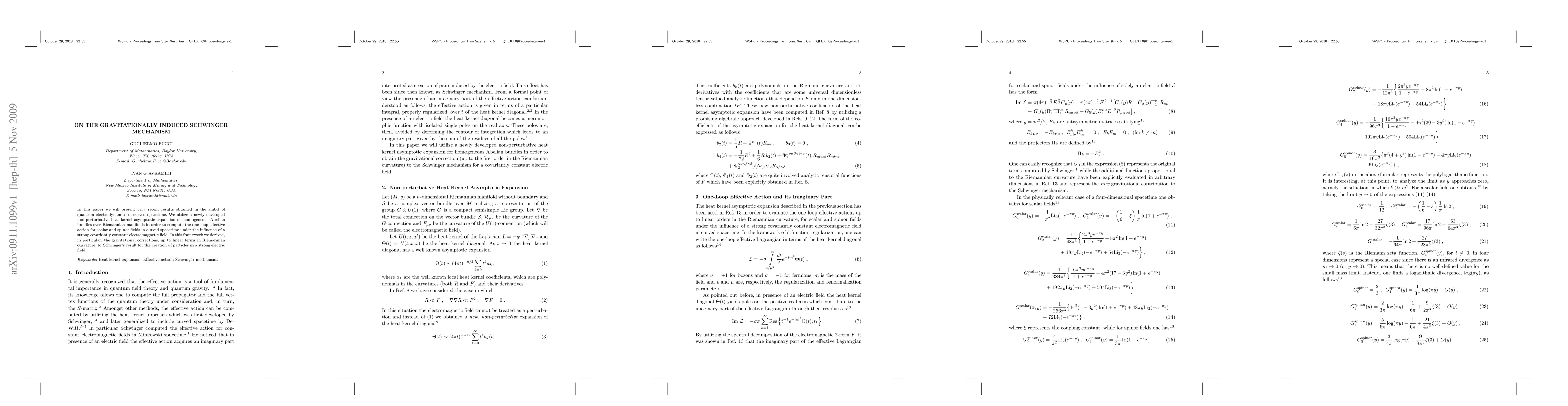 In this paper we will present very recent results obtained in the ambit of quantum electrodynamics in curved spacetime. We utilize a newly developed non-perturbative heat kernel asymptotic expansion on homogeneous Abelian bundles over Riemannian manifolds in order to compute the one-loop effective action for scalar and spinor fields in curved spacetime under the influence of a strong covariantly constant electromagnetic field. In this framework we derived, in particular, the gravitational corrections, up to linear terms in Riemannian curvature, to Schwinger's result for the creation of particles in a strong electric field.
