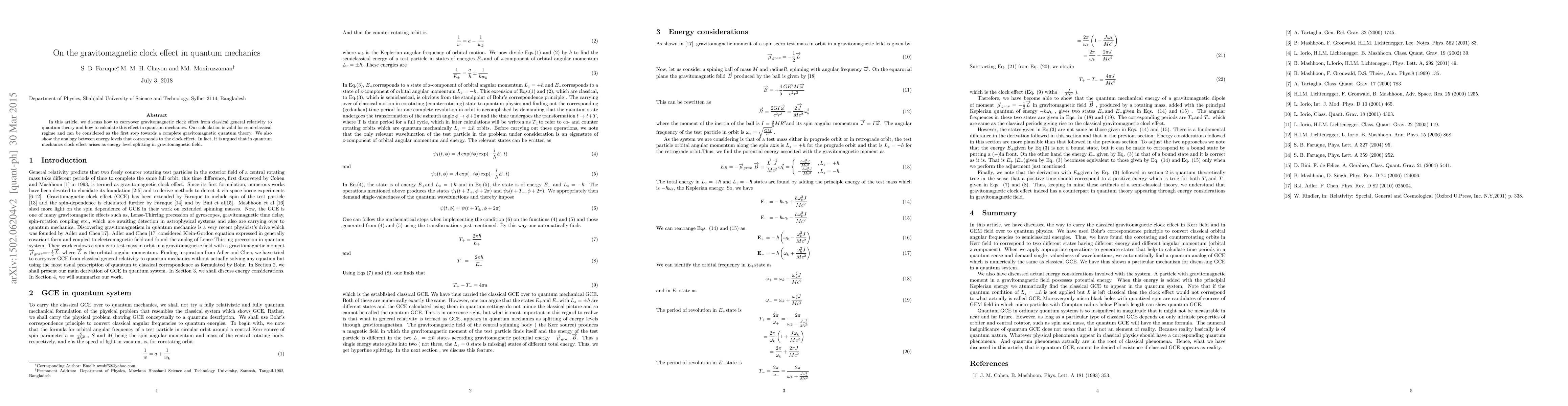 This paper explores the transition of the gravitomagnetic clock effect from classical general relativity to quantum mechanics, demonstrating its calculation in the semi-classical regime and highlighting the analogy between the clock effect and energy level splitting in gravitomagnetic fields.