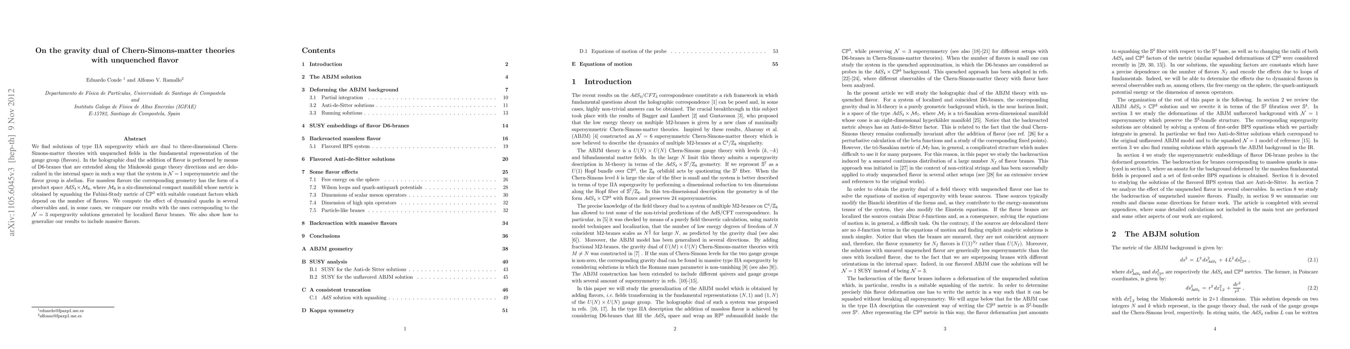This paper presents type IIA supergravity solutions dual to three-dimensional Chern-Simons-matter theories with unquenched flavors, employing D6-branes for flavor addition. The geometry for massless flavors is a product space AdS_4 x M_6, where M_6 is a compact six-dimensional manifold derived from CP^3.