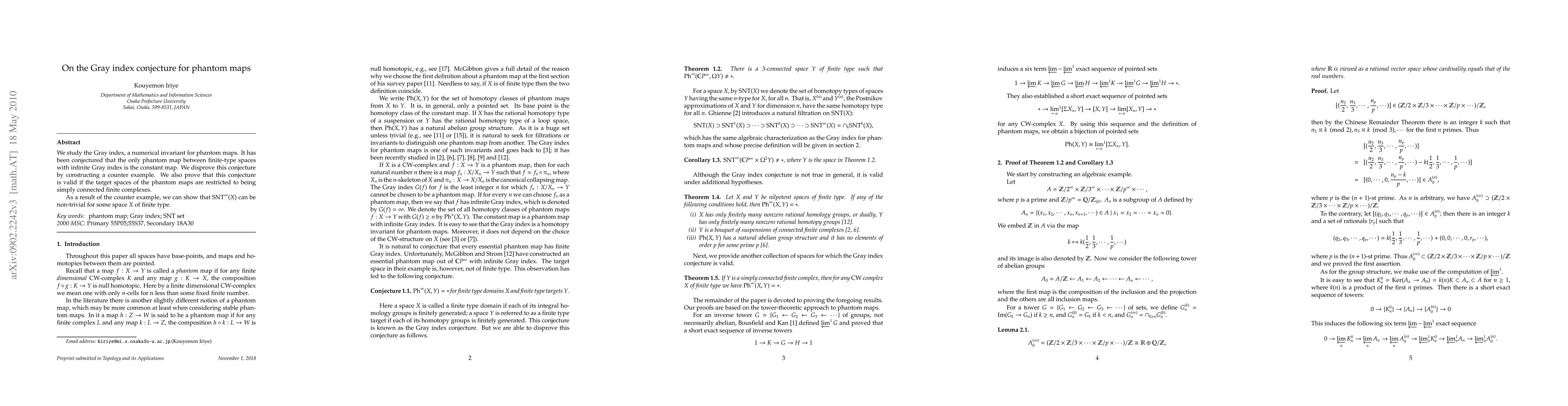 This paper disproves the Gray index conjecture for phantom maps by constructing a counterexample, showing that not all phantom maps with infinite Gray index are constant. It also proves the conjecture holds when target spaces are restricted to simply connected finite complexes. The counterexample demonstrates that $\SNT^{\infty}(X)$ can be non-trivial for certain finite-type spaces $X$.