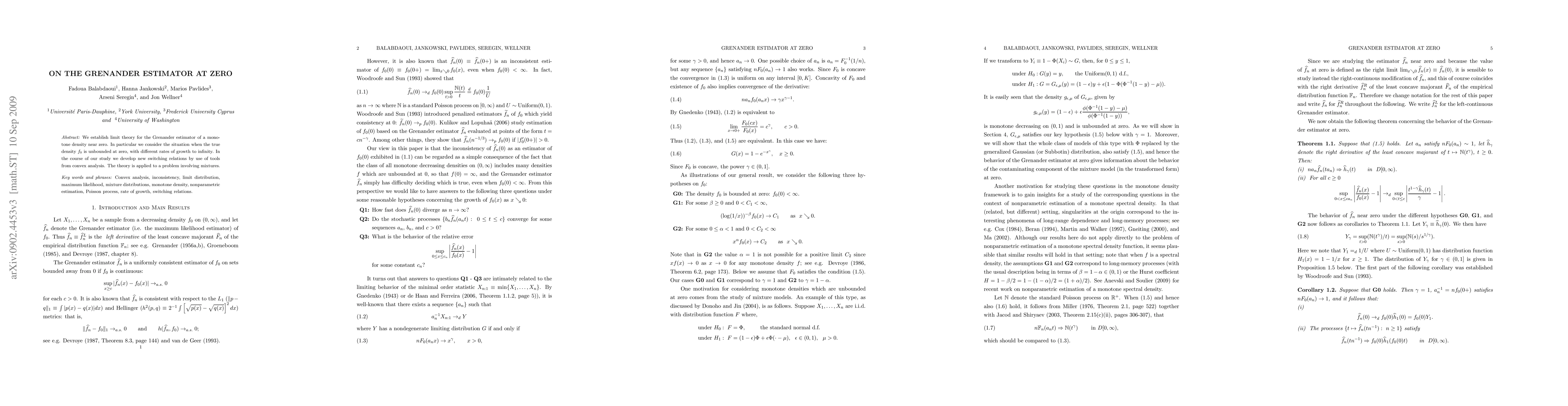 The paper develops limit theory for the Grenander estimator in monotone density situations with unbounded true densities at zero, applying convex analysis tools to switching relations, and demonstrating its application to mixture problems.