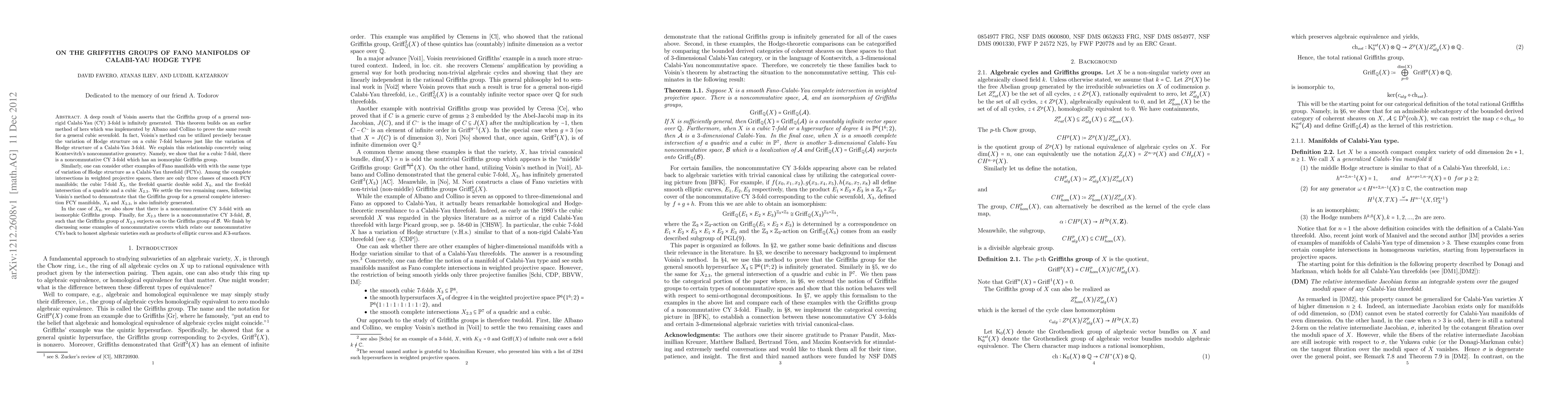 A deep result of Voisin asserts that the Griffiths group of a general non-rigid Calabi-Yau (CY) 3-fold is infinitely generated. This theorem builds on an earlier method of hers which was implemented by Albano and Collino to prove the same result for a general cubic sevenfold. In fact, Voisin's method can be utilized precisely because the variation of Hodge structure on a cubic 7-fold behaves just like the variation of Hodge structure of a Calabi-Yau 3-fold. We explain this relationship concretely using Kontsevitch's noncommutative geometry. Namely, we show that for a cubic 7-fold, there is a noncommutative CY 3-fold which has an isomorphic Griffiths group. Similarly, one can consider other examples of Fano manifolds with with the same type of variation of Hodge structure as a Calabi-Yau threefold (FCYs). Among the complete intersections in weighted projective spaces, there are only three classes of smooth FCY manifolds; the cubic 7-fold, the fivefold quartic double solid, and the fivefold intersection of a quadric and a cubic. We settle the two remaining cases, following Voisin's method to demonstrate that the Griffiths group for a smooth general complete intersection FCY manifolds, is also infinitely generated. In the case of the fivefold quartic double solid, we also show that there is a noncommutative CY 3-fold with an isomorphic Griffiths group. Finally, for the fivefold intersection of a quadric and a cubic there is a noncommutative CY 3-fold, such that the Griffiths group of the intersection surjects on to the Griffiths group of noncommutative 3-fold. We finish by discussing some examples of noncommutative covers which relate our noncommutative CYs back to honest algebraic varieties such as products of elliptic curves and K3-surfaces.
