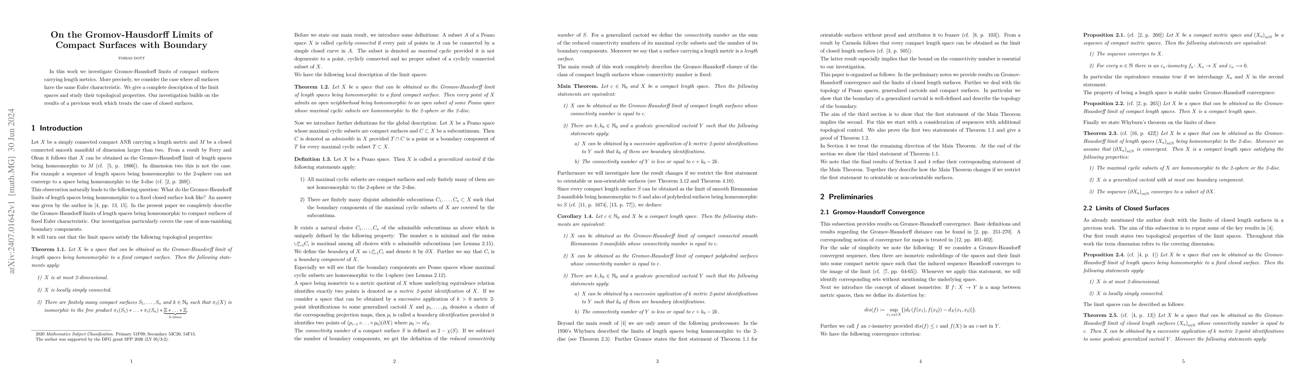 In this work we investigate Gromov-Hausdorff limits of compact surfaces carrying length metrics. More precisely, we consider the case where all surfaces have the same Euler characteristic. We give a complete description of the limit spaces and study their topological properties. Our investigation builds on the results of a previous work which treats the case of closed surfaces.