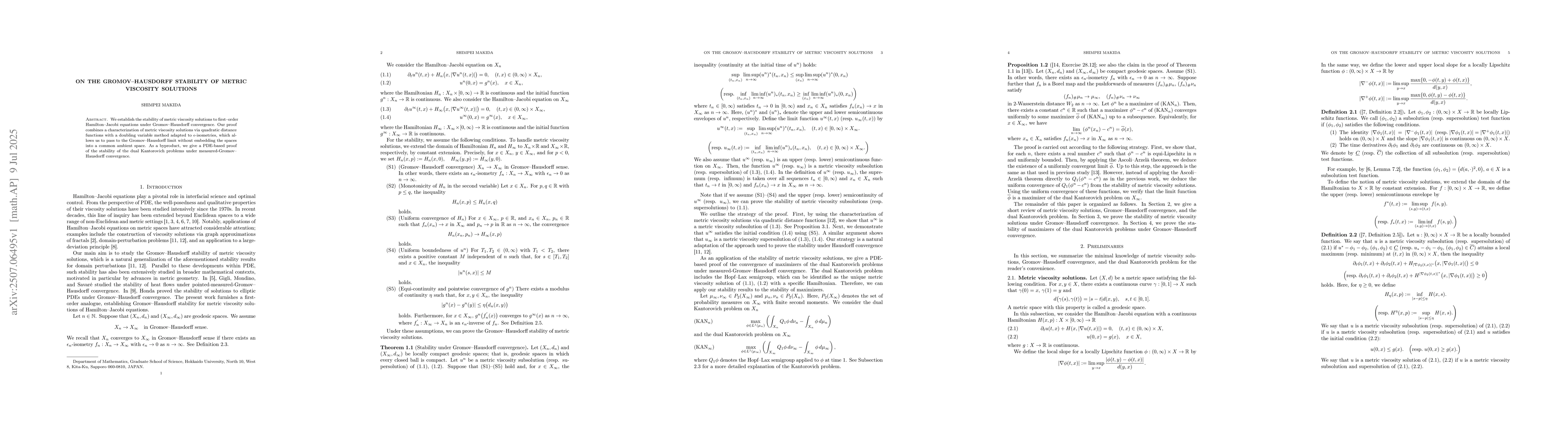 We establish the stability of metric viscosity solutions to first-order Hamilton--Jacobi equations under Gromov--Hausdorff convergence. Our proof combines a characterization of metric viscosity solutions via quadratic distance functions with a doubling variable method adapted to epsilon-isometries, which allows us to pass to the Gromov--Hausdorff limit without embedding the spaces into a common ambient space. As a byproduct, we give a PDE-based proof of the stability of the dual Kantorovich problems under measured-Gromov--Hausdorff convergence.