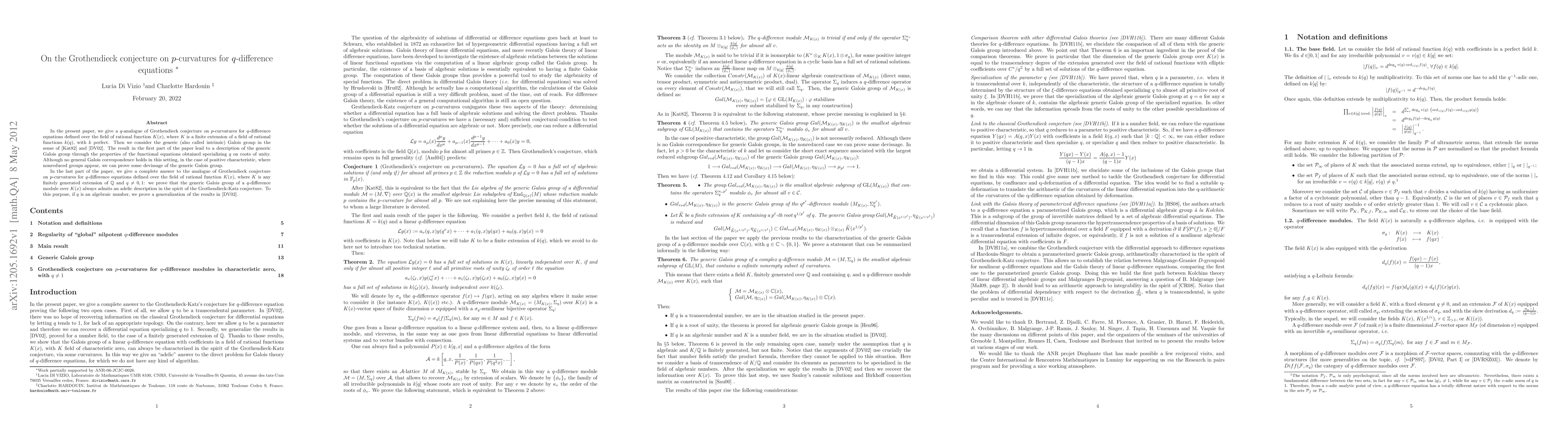 This paper provides a q-analog of the Grothendieck conjecture on p-curvatures for q-difference equations over rational function fields. It describes the generic Galois group through functional equations and proves a devissage of the generic Galois group in positive characteristic, concluding with an adelic description of the generic Galois group for q-difference modules over finitely generated extensions of \(\mathbb{Q}\).