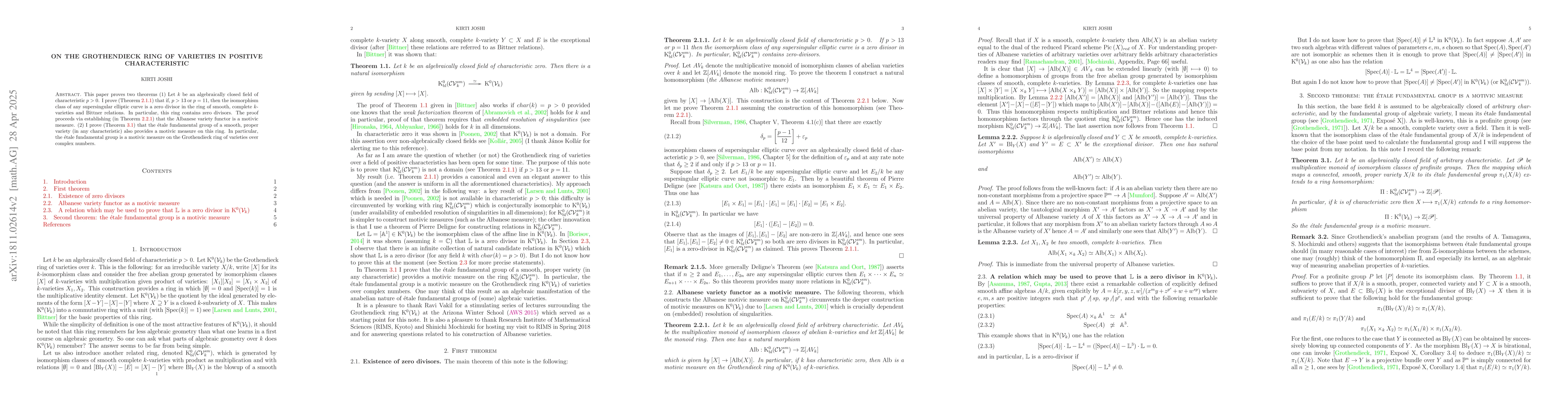 This paper demonstrates that the Grothendieck ring of smooth, complete varieties over an algebraically closed field of characteristic $p>0$ contains zero divisors when $p>13$ or $p=11$. Specifically, it shows that supersingular elliptic curves become zero divisors under these conditions.