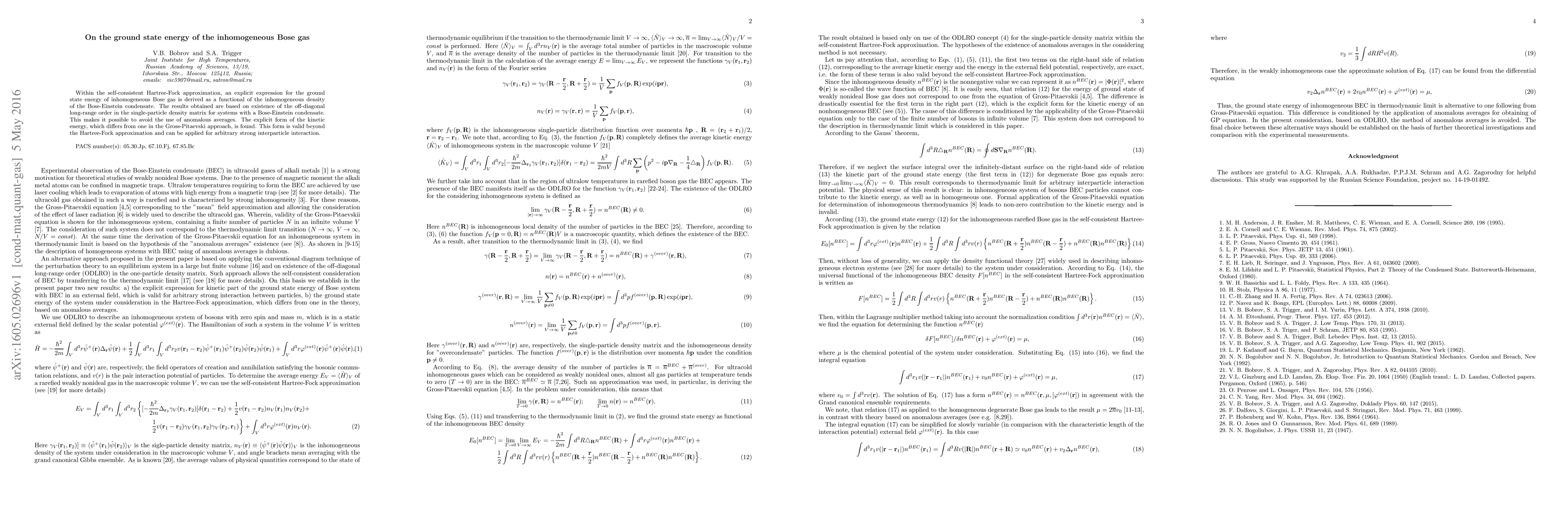 Within the self-consistent Hartree-Fock approximation, an explicit expression for the ground state energy of inhomogeneous Bose gas is derived as a functional of the inhomogeneous density of the Bose-Einstein condensate. The results obtained are based on existence of the off-diagonal long-range order in the single-particle density matrix for systems with a Bose-Einstein condensate. This makes it possible to avoid the use of anomalous averages. The explicit form of the kinetic energy, which differs from one in the Gross-Pitaevski approach, is found. This form is valid beyond the Hartree-Fock approximation and can be applied for arbitrary strong interparticle interaction.