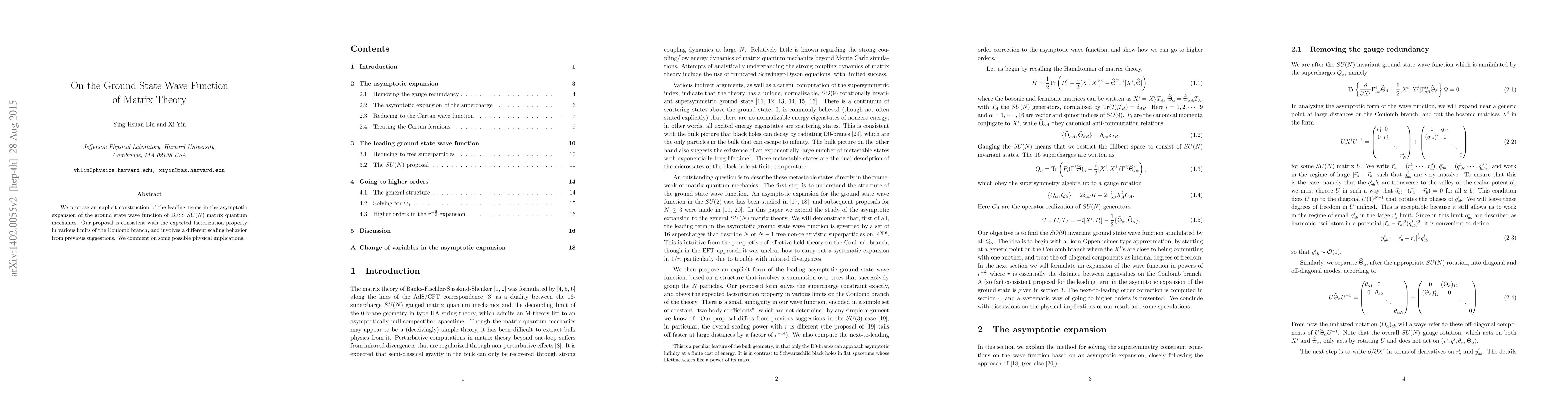 The paper presents a novel construction of the leading terms in the asymptotic expansion of the ground state wave function for BFSS SU(N) matrix quantum mechanics. The proposed form adheres to the expected factorization property across Coulomb branch limits, showcasing distinct scaling behavior compared to prior suggestions. The authors discuss potential physical implications of their findings.