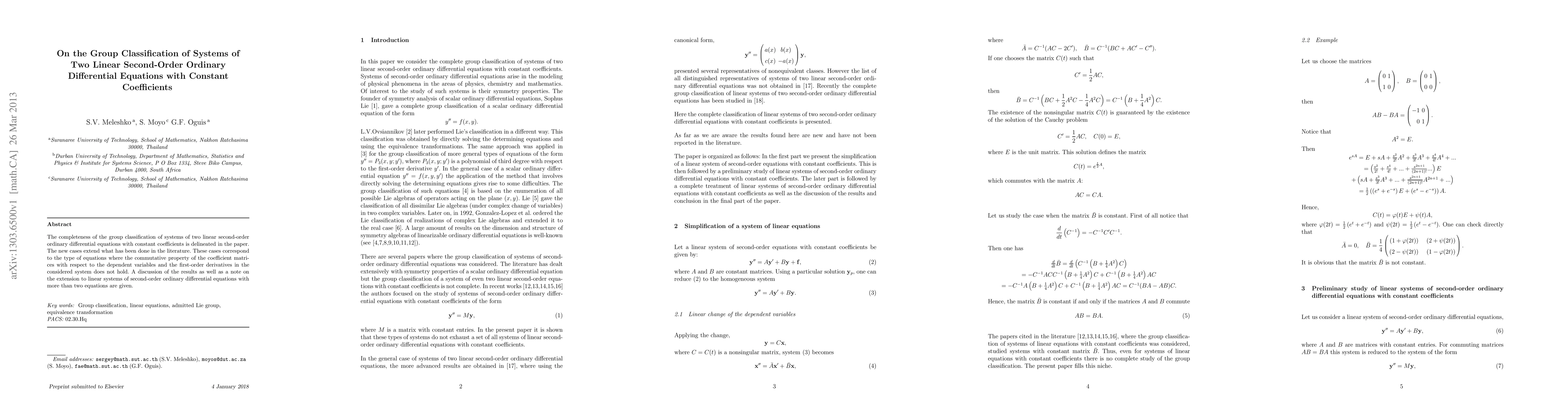 This paper completes the group classification of systems of two linear second-order ordinary differential equations with constant coefficients, addressing new cases where coefficient matrix commutativity fails. It also discusses potential extensions to systems with more equations.