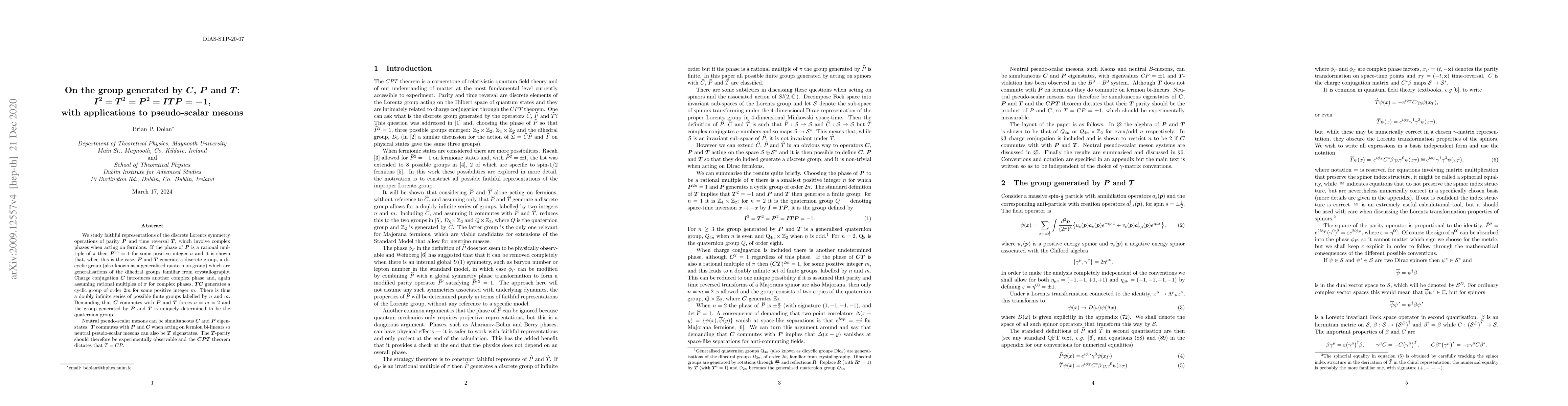We study faithful representations of the discrete Lorentz symmetry operations of parity $\mathbf P$ and time reversal $\mathbf T$, which involve complex phases when acting on fermions. If the phase of $\mathbf P$ is a rational multiple of $\pi$ then $\mathbf P^{2 n}=1$ for some positive integer $n$ and it is shown that, when this is the case, $\mathbf P$ and $\mathbf T$ generate a discrete group, a dicyclic group (also known as a generalised quaternion group) which are generalisations of the dihedral groups familiar from crystallography. Charge conjugation $\mathbf C$ introduces another complex phase and, again assuming rational multiples of $\pi$ for complex phases, $\mathbf T \mathbf C$ generates a cyclic group of order $2 m$ for some positive integer $m$.There is thus a doubly infinite series of possible finite groups labelled by $n$ and $m$. Demanding that $\mathbf C$ commutes with $\mathbf P$ and $\mathbf T$ forces $n=m=2$ and the group generated by $\mathbf P$ and $\mathbf T$ is uniquely determined to be the quaternion group. Neutral pseudo-scalar mesons can be simultaneous $\mathbf C$ and $\mathbf P$ eigenstates. $\mathbf T$ commutes with $\mathbf P$ and $\mathbf C$ when acting on fermion bi-linears so neutral pseudo-scalar mesons can also be $\mathbf T$ eigenstates. The $\mathbf T$-parity should therefore be experimentally observable and the $\mathbf{CPT}$ theorem dictates that $T= C P$.