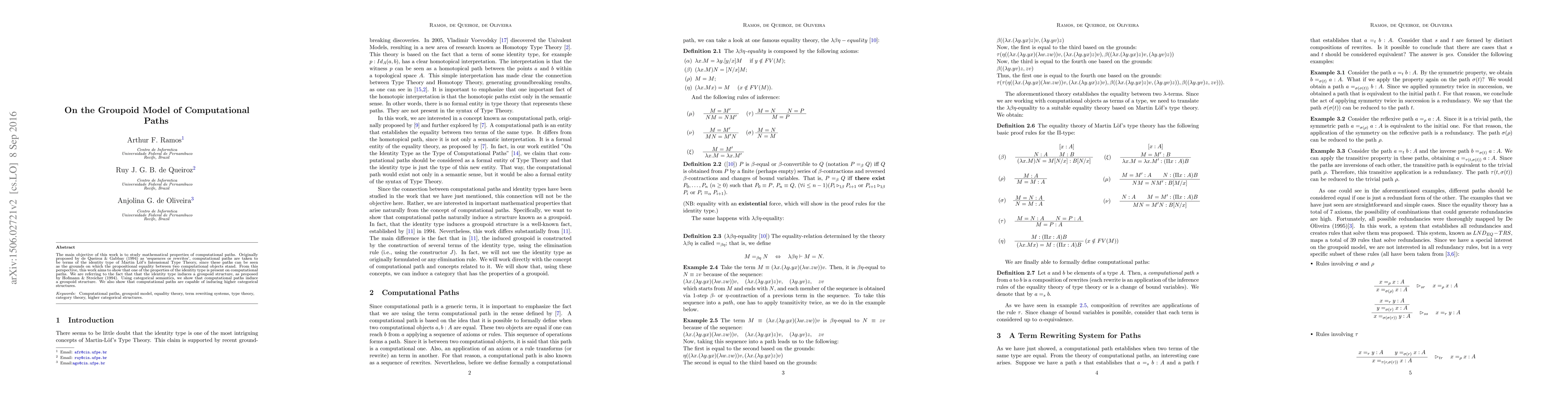 This paper explores the mathematical properties of computational paths, originally defined as sequences or rewrites, and demonstrates that they induce a groupoid structure akin to the identity type in Martin L\"of's Intensional Type Theory. It further shows that these paths can generate higher categorical structures using categorical semantics.
