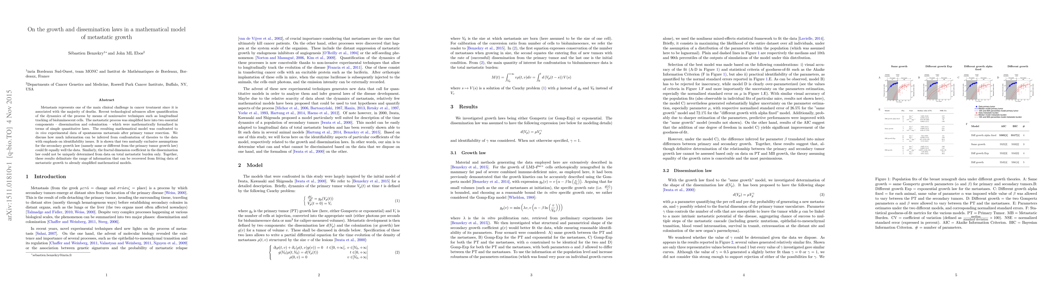This paper develops a mathematical model to describe the dissemination and colonization phases of metastasis, comparing it to experimental data. It highlights challenges in identifying growth laws and determining fractal dimensions due to the model's simplification, emphasizing the limitations in extracting detailed information from fitting data to theoretical models.