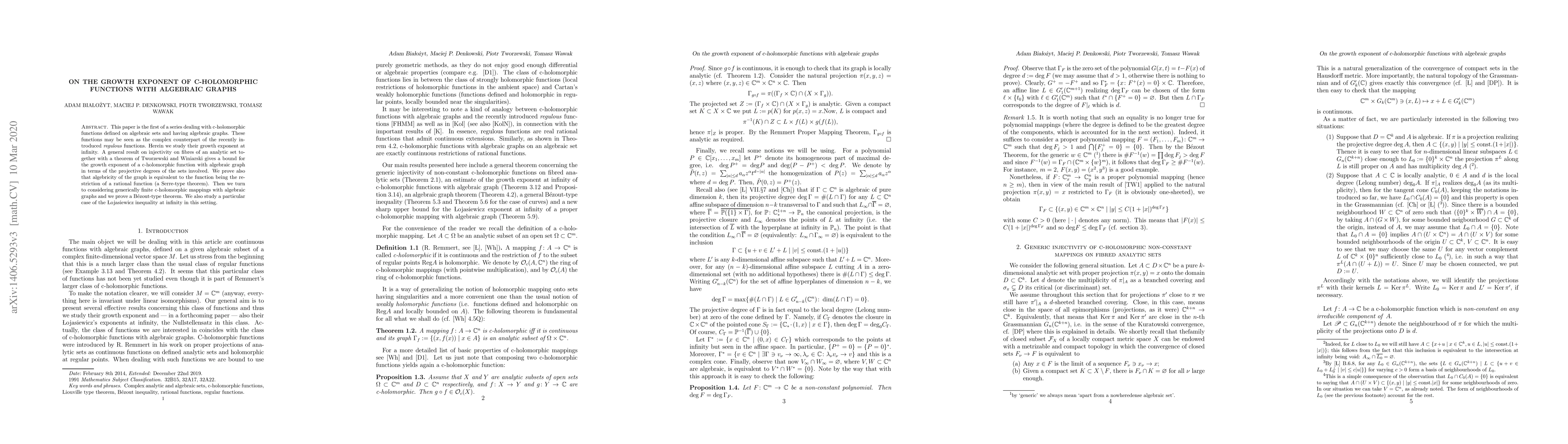 This paper is the first of a series dealing with c-holomorphic functions defined on algebraic sets and having algebraic graphs. These functions may be seen as the complex counterpart of the recently introduced \textit{regulous} functions. Herein we study their growth exponent at infinity. A general result on injectivity on fibres of an analytic set together with a theorem of Tworzewski and Winiarski gives a bound for the growth exponent of a c-holomorphic function with algebraic graph in terms of the projective degrees of the sets involved. We prove also that algebricity of the graph is equivalent to the function being the restriction of a rational function (a Serre-type theorem). Then we turn to considering generically finite c-holomorphic mappings with algebraic graphs and we prove a B\'ezout-type theorem. We also study a particular case of the \L ojasiewicz inequality at infinity in this setting.