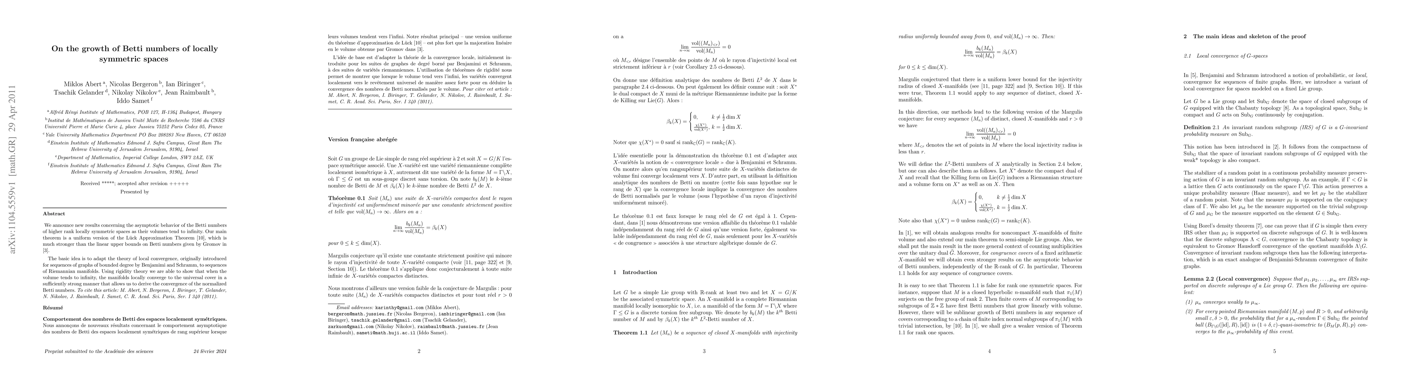 We announce new results concerning the asymptotic behavior of the Betti numbers of higher rank locally symmetric spaces as their volumes tend to infinity. Our main theorem is a uniform version of the L\"uck Approximation Theorem \cite{luck}, which is much stronger than the linear upper bounds on Betti numbers given by Gromov in \cite{BGS}. The basic idea is to adapt the theory of local convergence, originally introduced for sequences of graphs of bounded degree by Benjamimi and Schramm, to sequences of Riemannian manifolds. Using rigidity theory we are able to show that when the volume tends to infinity, the manifolds locally converge to the universal cover in a sufficiently strong manner that allows us to derive the convergence of the normalized Betti numbers.