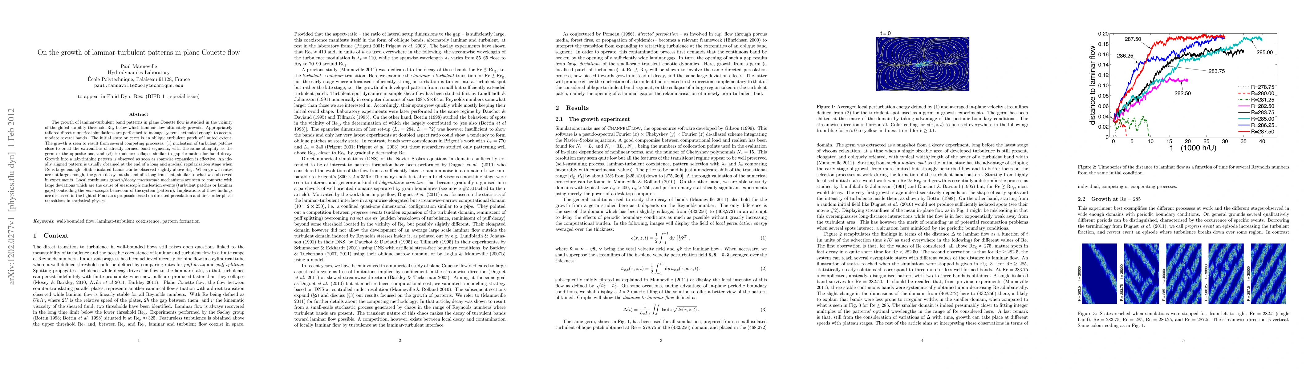 This study investigates the growth dynamics of laminar-turbulent band patterns in plane Couette flow near the global stability threshold, revealing the interplay between nucleation of turbulent patches and turbulence collapse, leading to complex labyrinthine patterns and stable isolated bands. The findings align with Pomeau's models of directed percolation and phase transitions.