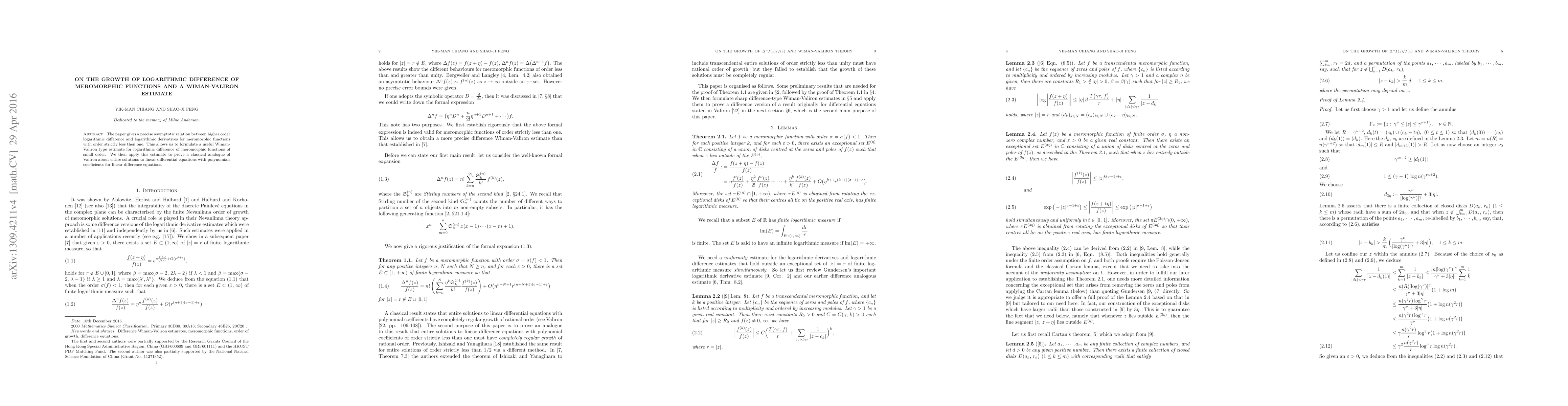 The paper establishes an asymptotic relation between higher order logarithmic differences and derivatives for meromorphic functions of small order, leading to a new Wiman-Valiron estimate. This estimate is then utilized to prove a classical analogue of Valiron's theorem for entire solutions to linear difference equations with polynomial coefficients.