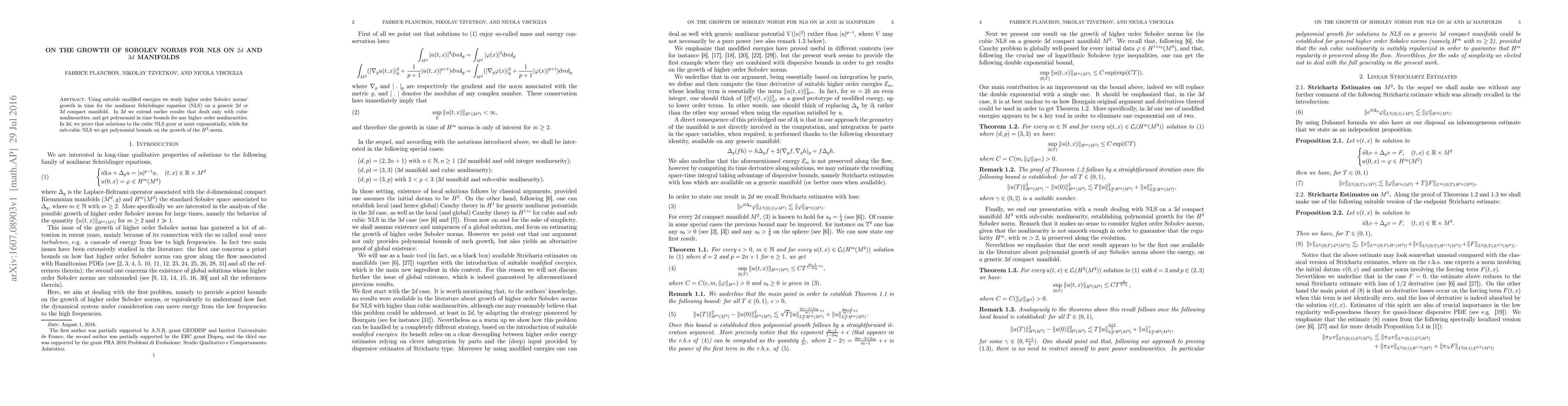 Using suitable modified energies we study higher order Sobolev norms' growth in time for the nonlinear Schr\"odinger equation (NLS) on a generic $2d$ or $3d$ compact manifold. In $2d$ we extend earlier results that dealt only with cubic nonlinearities, and get polynomial in time bounds for any higher order nonlinearities. In $3d$, we prove that solutions to the cubic NLS grow at most exponentially, while for sub-cubic NLS we get polynomial bounds on the growth of the $H^2$-norm.